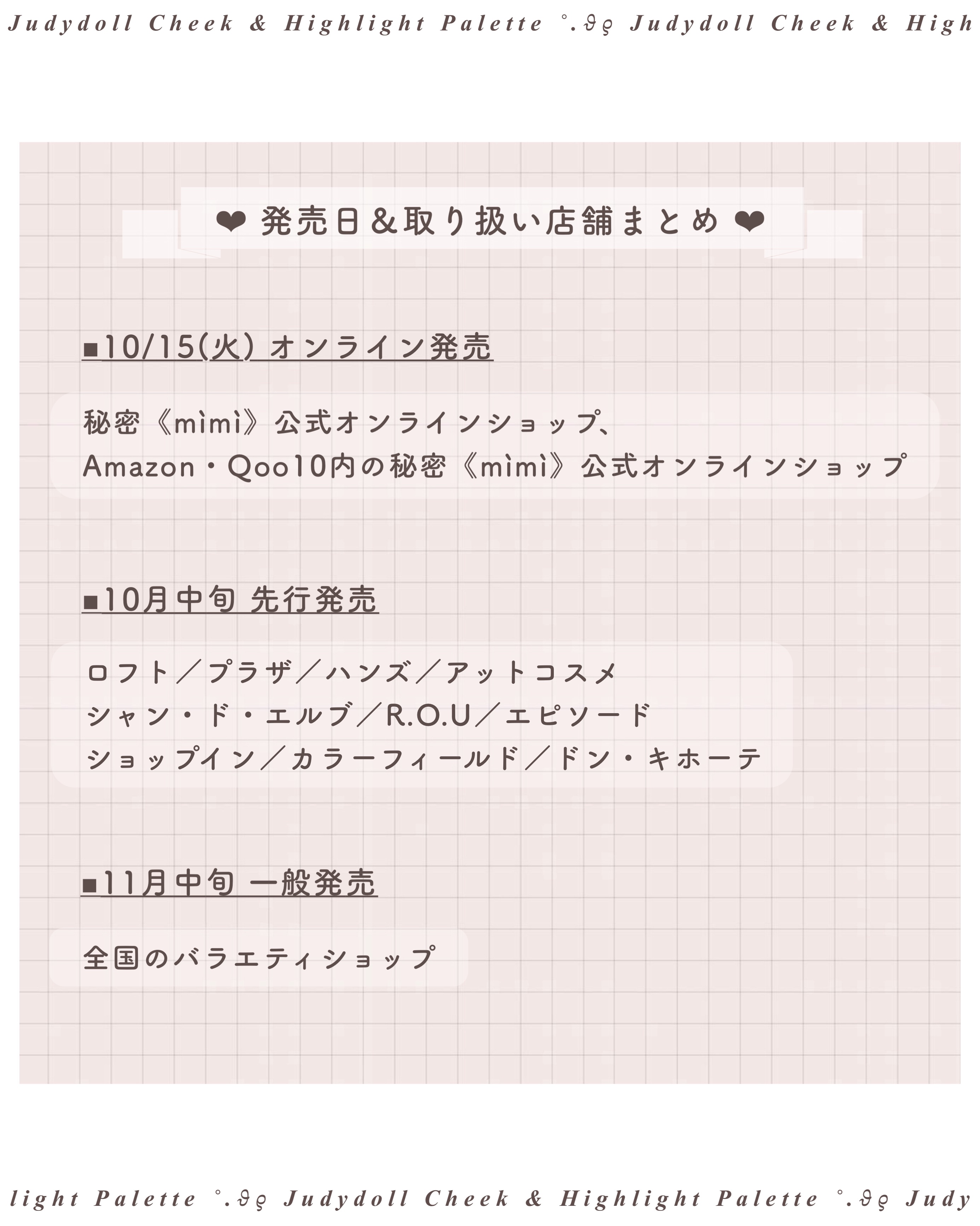- ※2025年7月下旬以降、順次商品パッケージをリニューアル。尚、これにかかる商品の返品・交換は承っておりません。 テクスチャーが異なる3色のチークとマットハイライトが入ったマルチパレット。 マットハイライトはお顔の凹みにのせてパッと垢抜け!メイク直しや涙袋演出にもオススメ。 チークカラーはアイシャドウとしても使えるので、いつでも気軽に”全顔統一メイク”に。 その日の気分で使い分けられる、きまぐれわがまま女子の味方。 ・2024年10/15(火) オンライン発売 秘密《mìmì》公式オンラインショップ、Amazon・Qoo10内の秘密《mìmì》公式オンラインショップ ・2024年10月中旬 先行発売 ロフト様、プラザ様、ハンズ様、アットコスメ様、シャン・ド・エルブ様、R.O.U様、エピソード様、ショップイン様、カラーフィールド様、ドン・キホーテ様 ・2024年11月中旬 一般発売 全国のバラエティショップ