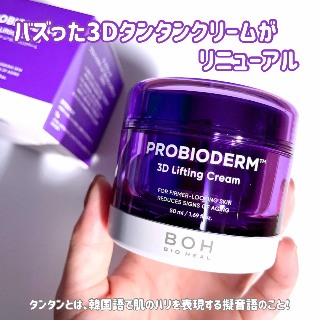 - プロバイオダーム™ 3D リフティングクリーム ・既存のタンタンクリームが、より一層のハリ弾力ケアができる商品としてパワーアップ※! ★プロバイオダーム™ 3Dリフティングクリームリニューアルポイント★ ①BIOHEAL BOHが厳選した乳酸菌*のみ配合した独自保湿成分!「プロバイオダーム™」 BIOHEAL BOHの厳しい審査のもとに選び抜かれた肌バリアをサポートする独自の乳酸菌*でハリ弾力ケアを! →キーワード #ハリ活乳酸菌 *厳選した乳酸菌:ラクトバチルスプランタラム&ラクトバチルスラムノサス&ラクトバチルスロイテリ(全て保湿) ②肌本来の弾力維持に欠かせない成分をプラス!肌が持つ成分を補うことで、ふっくらうるおった肌のハリ感をキープ ③ペプチドが12種から17種に!肌バリアを形成。素肌をすこやかに保ちます。 ・もちっと密度の高いクリームで保湿&ハリケア。 バイオヒールボ独自の技術で肌表面をピンとハリをあたえ、よりハリ感が得られるテクスチャーを実現 ・3Dと訴求しているように、ふっくらうるおい感のある多面的な弾力ケアができることから、韓国語でしっかりハリのある様子を表現するタンタン(탄탄)のワードと組み合わせて「3Dタンタンシクリーム」という愛称ができました。 ・もちっと密度の高いクリームで弾力のある素肌に導くエイジングケア※2クリーム。 ※同商品リニューアル前に比べて ※2年齢に応じたケアの事