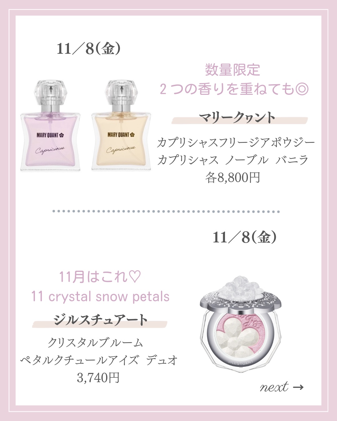エクセル2022年11月15日(火)発売 デイジードール2022年11月18日(金)発売 マジョリカマジョルカ2022年11月21日(月)発売 リリミュウ2022年11月21日(月)発売 キャンメイク2022年11月30日(水)発売 ヴィセ&ヴィセリシェ2022年12月1日(木)発売 セザンヌ2022年12月上旬発売 リップモンスター2022年11月&12月発売11月19日(土)発売👉ミニサイズ(既存2色)12月17(土)発売👉限定2色