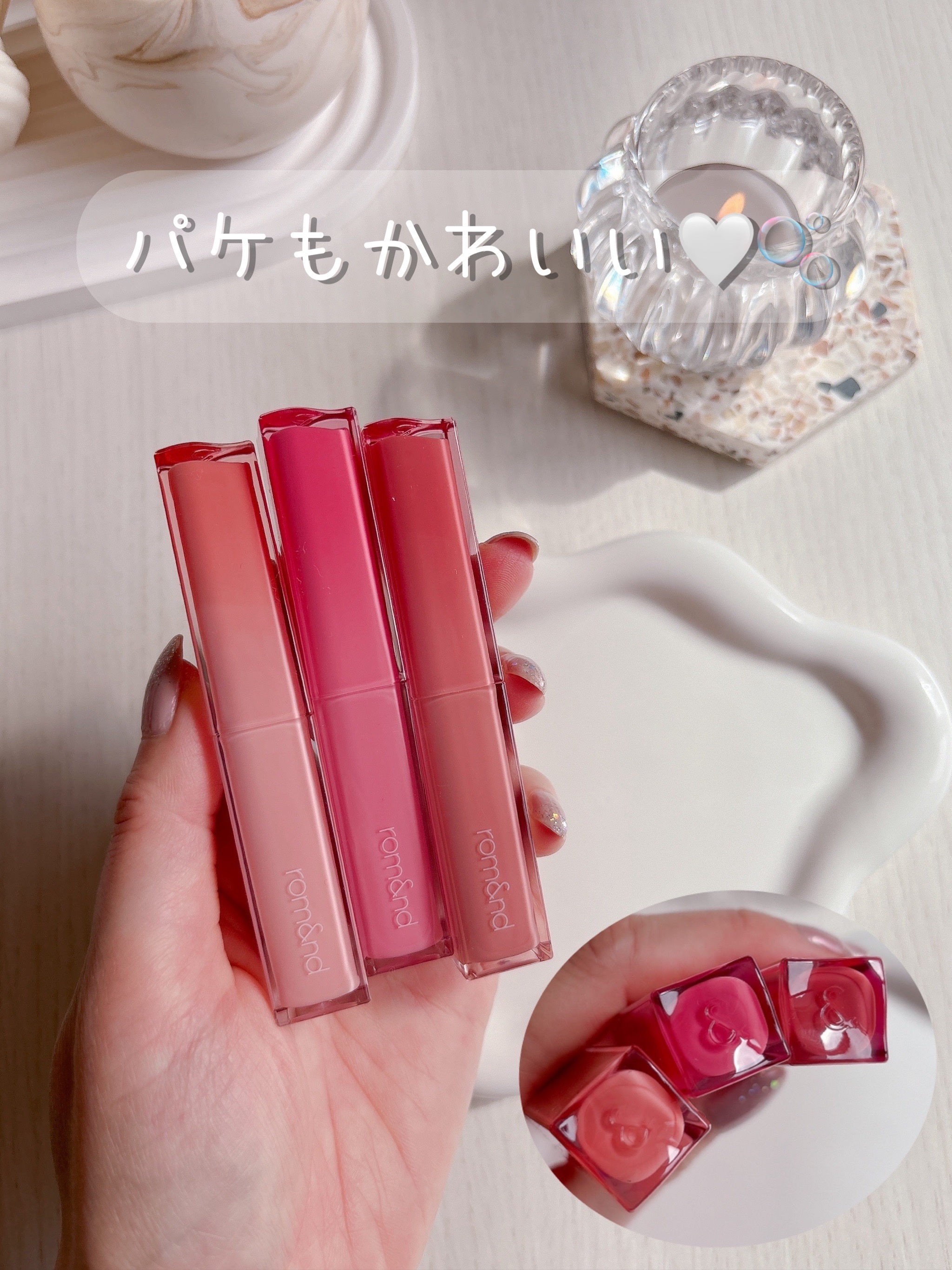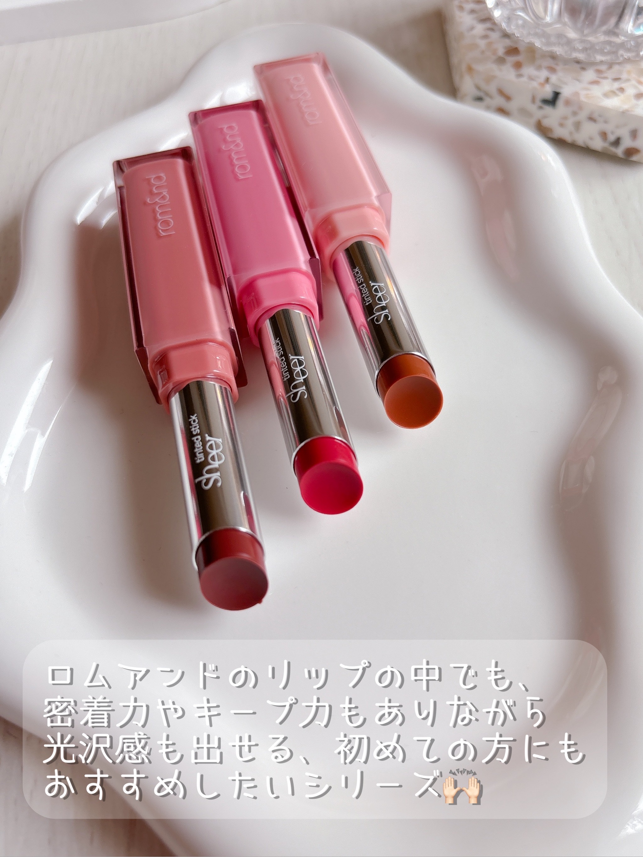 大人気ブランドrom&ndから8月30日に発売された新作リップ 最初のタッチのまま発色し、透き通った色味を長時間キープするシアーゼリーリップ💋 しっとり溶け込むように馴染む柔らかな塗り心地がお気に入り😍❤️ コツ要らずで派手すぎず、シアーな光沢を演出してくれます🫶🏻 負担の少ない軽めのリップを探している方は是非チェックしてみてくださいね🥰