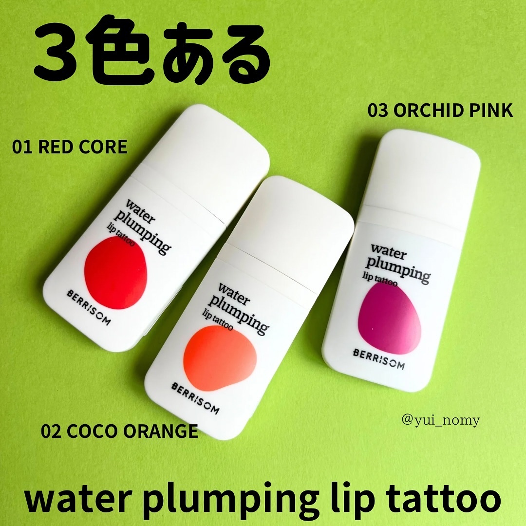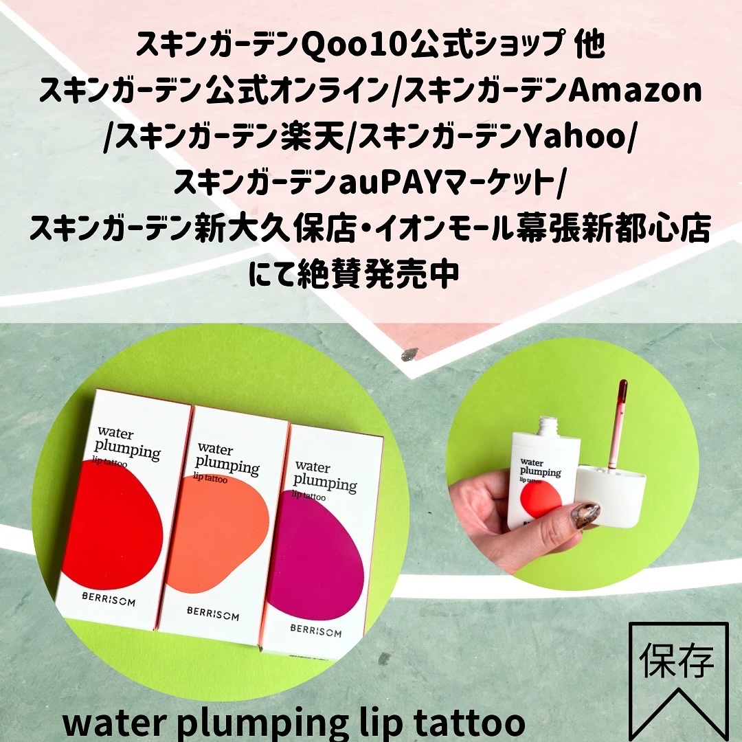 ベリサム ウォータープランピング リップタトゥー💋 プランピング効果でボリューム&水分&発色を32時間維持してくれるみたい! 飲食をしても全然色落ちしないから感動しちゃった🤭💗 高いカラー持続力のリップを探してる方は使ってみてほしい