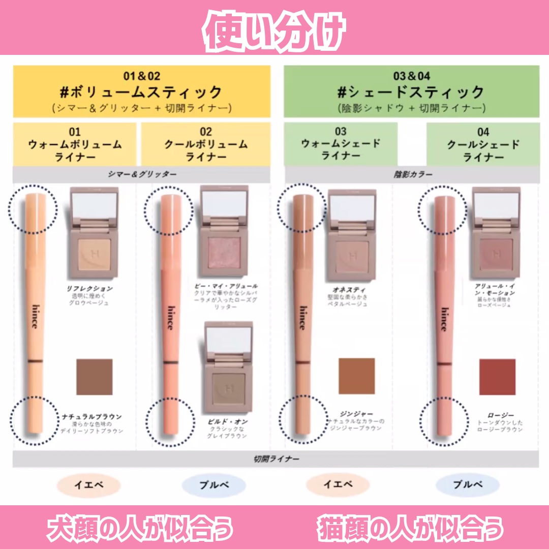 なんとナチュラルなカラー感で大好評のhince「ニューデップスアイシャドウ」がそのままスティックになったよ🥳 柔らかめの芯で、スルスルと簡単に描けちゃう!!涙袋に乗せるカラーは太めでちょうどいいし、影を描くためのカラーは細めで使いやすいところも良かった◎ 軽くなぞるだけで簡単に涙袋メイクができるから是非チェックしてね!!