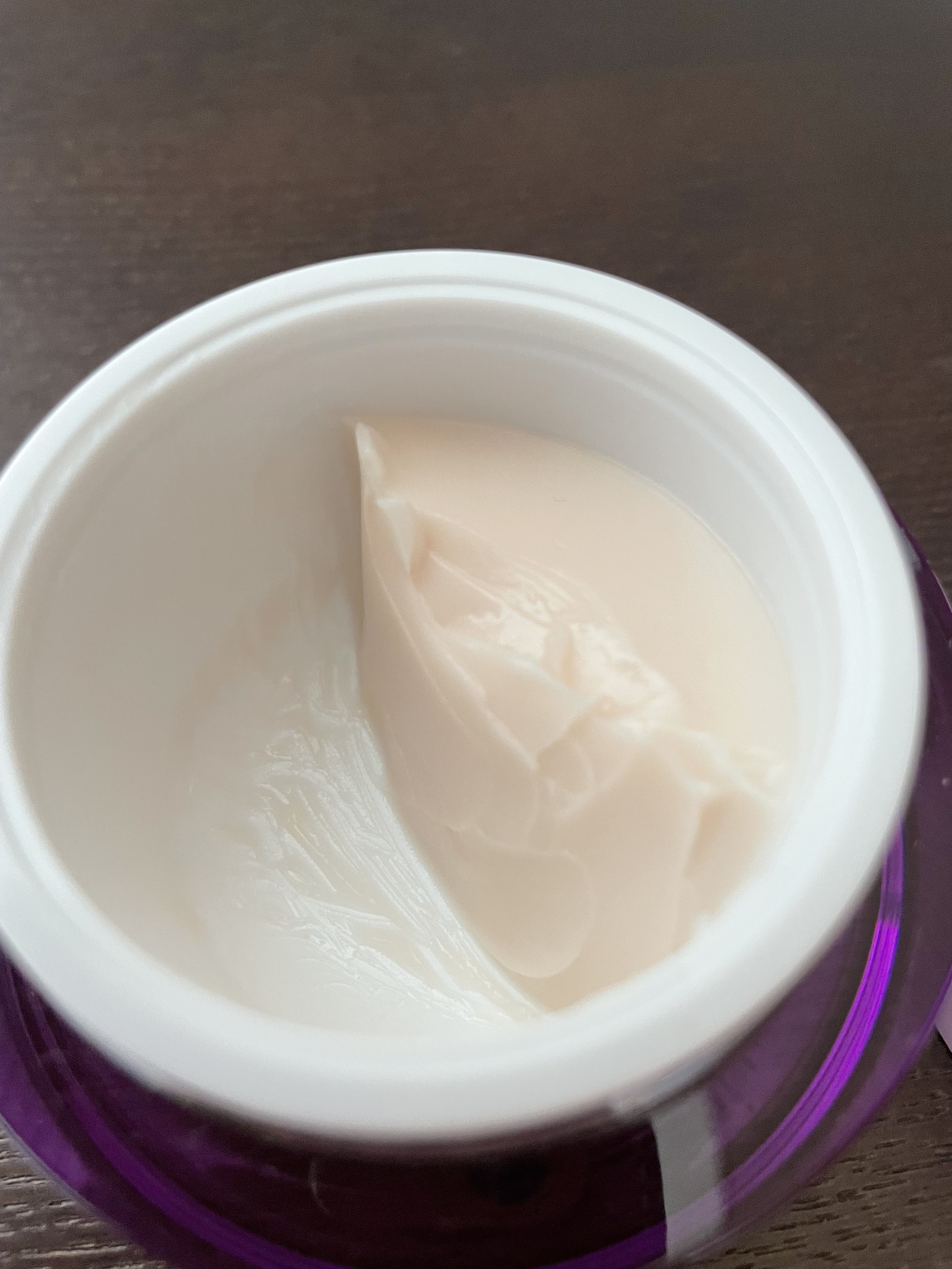プロバイオダーム™ 3Dリフティングクリームがパワーアップ 乳酸菌飲料のような色味。テクスチャはこっくり濃厚なクリーム✨ 付属スパチュラがついてるのですくって塗布できて衛生的に使い続けられる(* 'ᵕ' )☆ コラーゲンとプロバイオダーム™ 配合でゆるんだ毛穴をケアして毛穴の目立ちを抑えるそう。