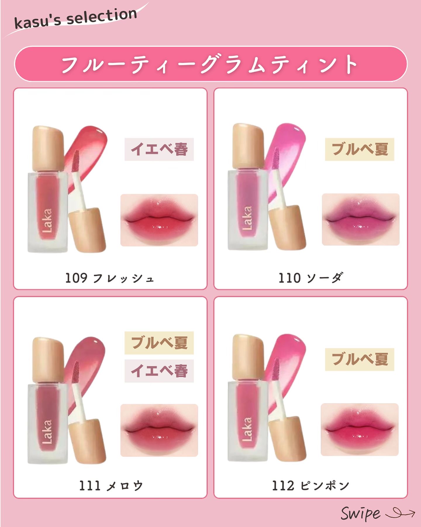 Lakaのフルーティーグラムティント✨️PC別でおすすめカラーをご紹介❕自分のPCで買っても可愛いし自分の好きなカラーで使ってもいいしとにかくカラバリ豊富だからついつい買っちゃうティント💦🌟ティッシュオフも結構残ってるから嬉しい🤭#コスメ#ラ...
