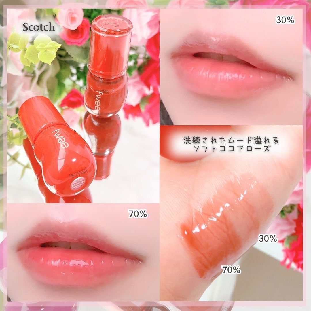 🫧fwee3DVolumingGlossVanilla70%Sorbet70%Aengdu70%Scotch30%いつのまにかこんなに持ってた…70%は単色でも十分なくらいの発色。上からVanilla70%、Sorbet70%、Aengdu7...
