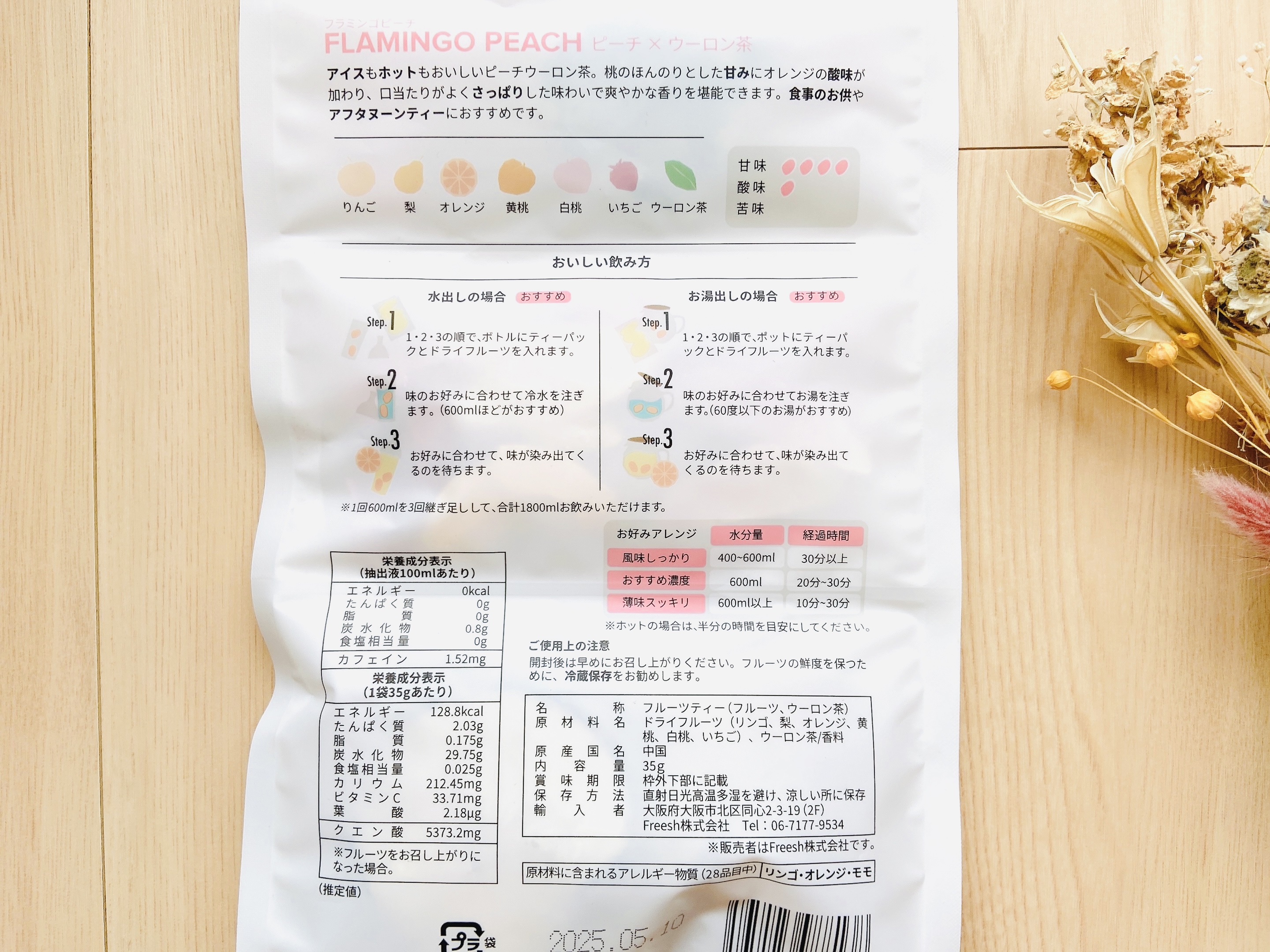 フリーズドライ製法で作られたフリーズドライフルーツ。ドライフルーツは加糖したものが多く、フルーツ本来の甘みを味えないそうですが砂糖不使用でフルーツをそのままフリーズドライにしているそう。 フラミンゴピーチ🍑 白桃、黄桃、リンゴ、梨、オレンジ、いちごの6種の果物とウーロン茶がコラボしたお茶。とろけるような芳醇な2種の桃の甘みとウーロン茶が組み合わさり、爽やかな香りを堪能できるこれまでに味わったことのないピーチウーロン茶は冷やしてもホットでも、両方楽しめるのが特徴です! ほんのり甘いピーチウーロン、フリーズドライの桃のフルーツの味がしみでて本物のフルーツの味がしっかりしてめちゃくちゃおいしかった、、、💕