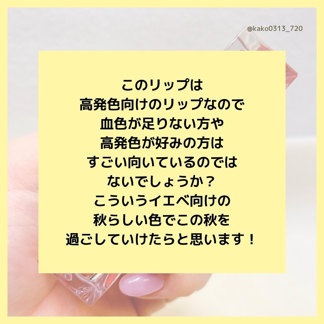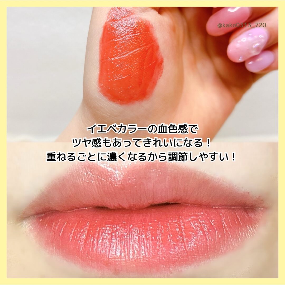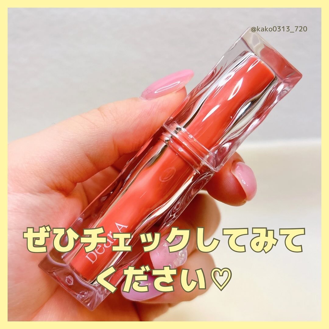 パケが可愛すぎる〜〜!!! せっかくなら見てて可愛い物を持ち歩きたいよね💕 01はイエベさん向きのコーラルカラー💄 元の唇の色に近くて馴染みはいいけど、しっかり発色だからメイクしてます!感もちゃんと出てくれます🫶 このうるつや感✨️ ねっとり感はあんまりなくてサラッと塗れるのに、ちゅるんとした水光感が出てくれるよ💖