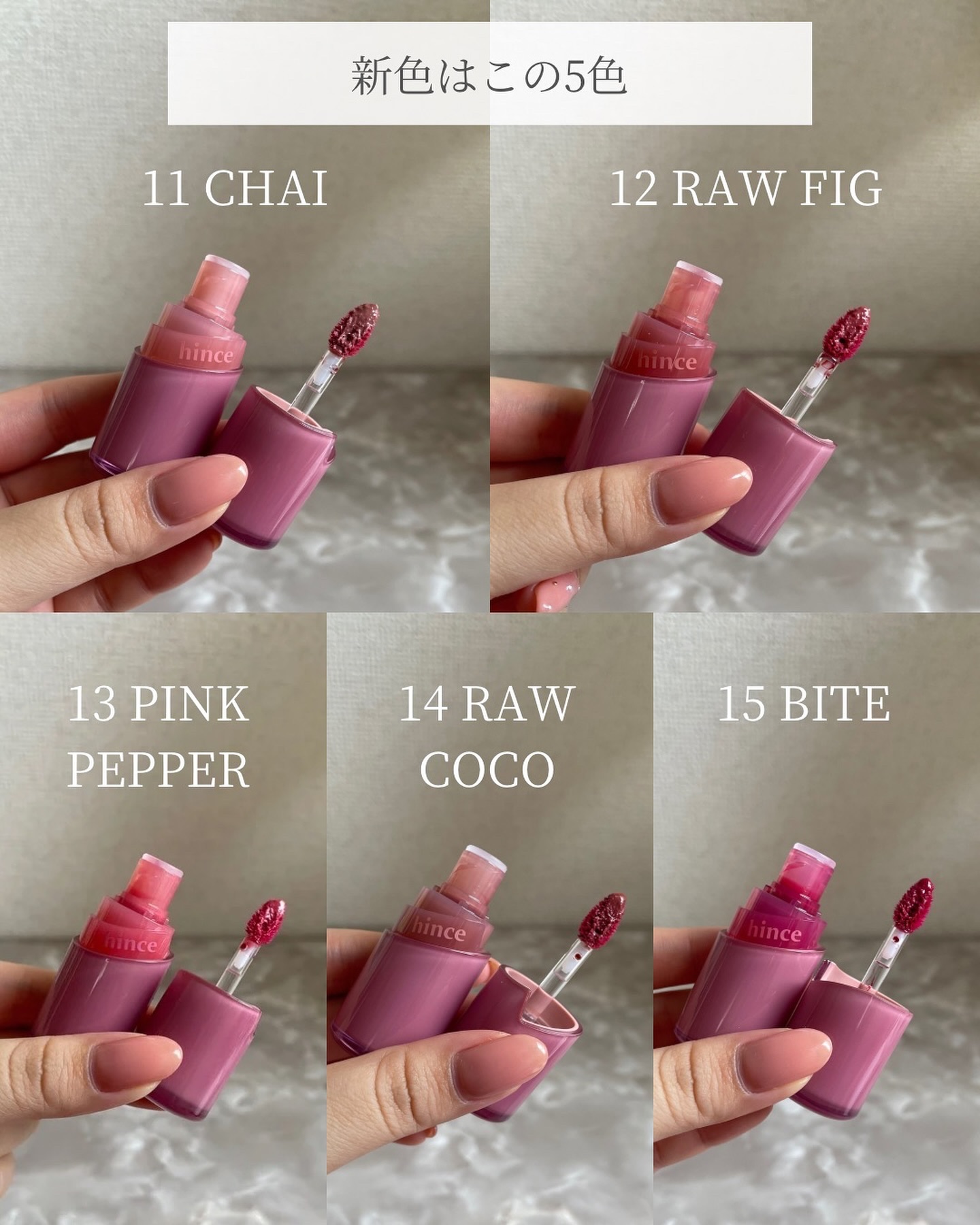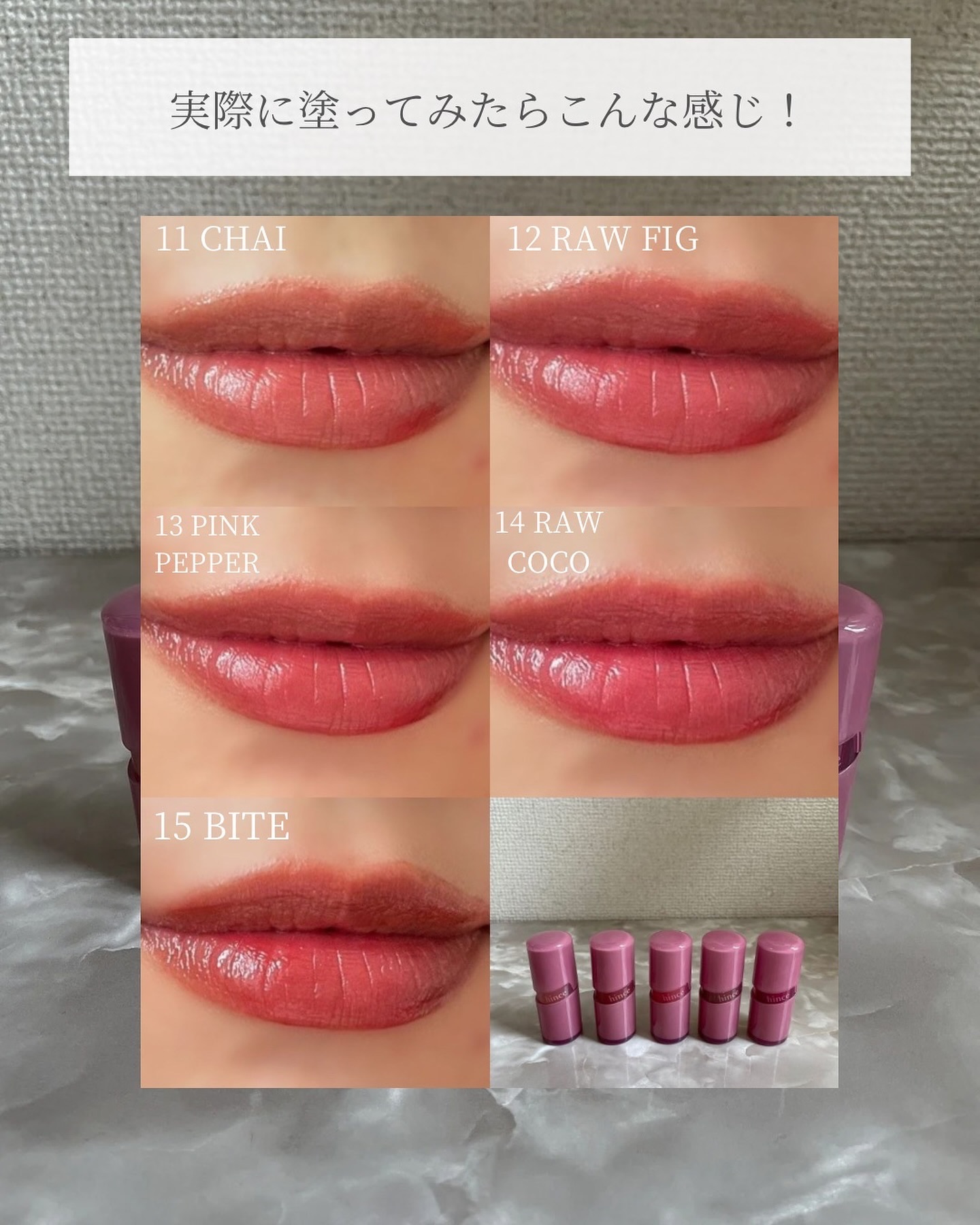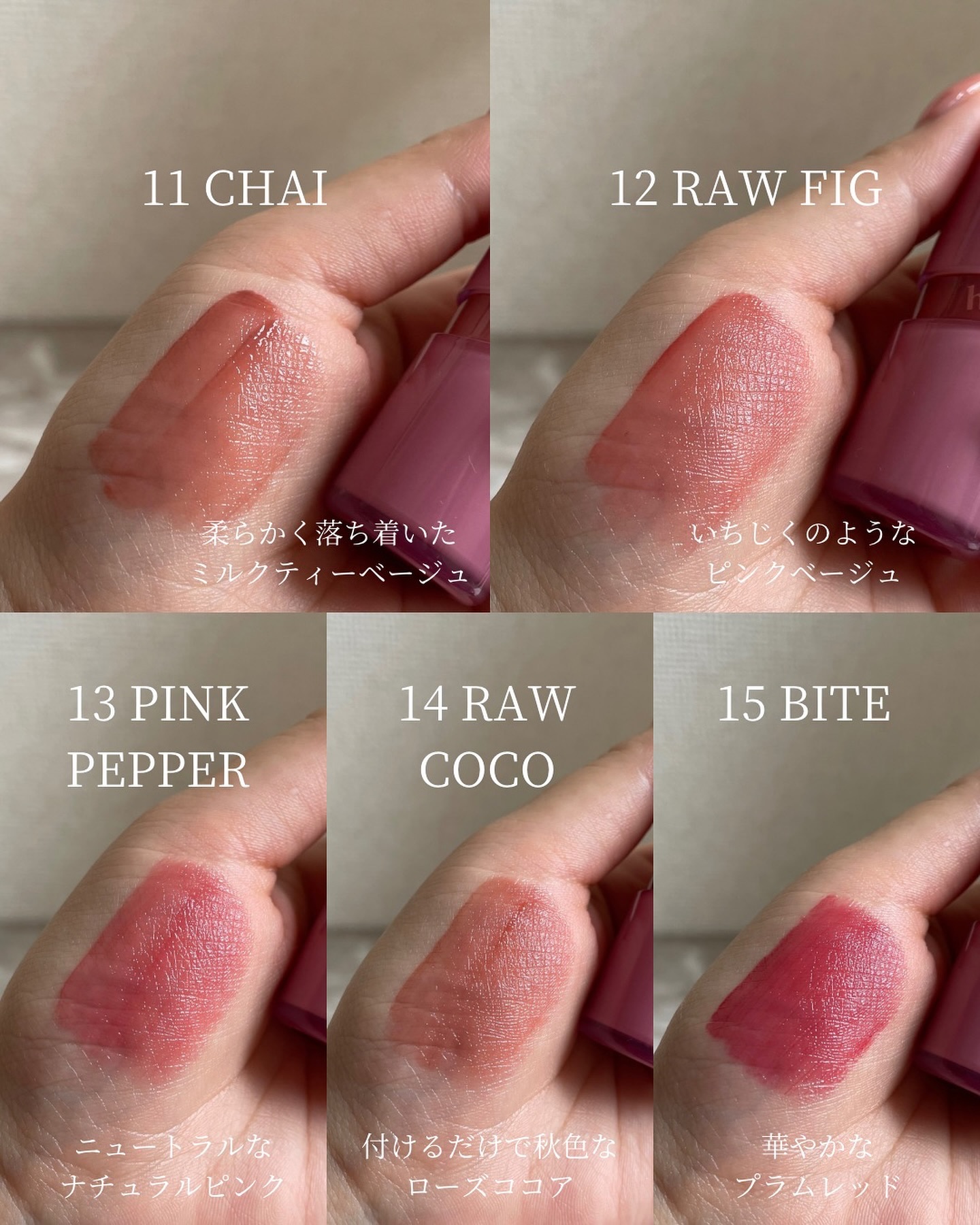- <R001 ベア> 水、ジフェニルジメチコン、オクチルドデカノール、ビスジグリセリルポリアシルアジペート-2、リンゴ酸ジイソステアリル、トリメチルシロキシフェニルジメチコン、水添ポリイソブテン、ジグリセリン、ポリソルベート60、BG、セチルPEG/PPG-10/1ジメチコン、1,2-ヘキサンジオール、ペンチレングリコール、(アクリル酸ヒドロキシエチル/アクリロイルジメチルタウリンNa)コポリマー、セテアレス-20、スクワラン、フェノキシエタノール、酸化チタン、香料、エチルヘキシルグリセリン、黄5、赤227、イソステアリン酸ソルビタン、水酸化Al、ポリアクリル酸アンモニウム、酢酸トコフェロール、黄4、青1、ヒアルロン酸Na、(アルギニン/リシン)ポリペプチド、加水分解ヒアルロン酸、トコフェロール、アセチルヒアルロン酸Na、ソルビン酸 <R002 ロウローズ> 水、ジフェニルジメチコン、オクチルドデカノール、ビスジグリセリルポリアシルアジペート-2、リンゴ酸ジイソステアリル、トリメチルシロキシフェニルジメチコン、水添ポリイソブテン、ジグリセリン、ポリソルベート60、BG、セチルPEG/PPG-10/1ジメチコン、1,2-ヘキサンジオール、ペンチレングリコール、(アクリル酸ヒドロキシエチル/アクリロイルジメチルタウリンNa)コポリマー、セテアレス-20、スクワラン、フェノキシエタノール、酸化チタン、香料、エチルヘキシルグリセリン、黄5、赤227、イソステアリン酸ソルビタン、酢酸トコフェロール、水酸化Al、ポリアクリル酸アンモニウム、ヒアルロン酸Na、青1、加水分解ヒアルロン酸、(アルギニン/リシン)ポリペプチド、トコフェロール、アセチルヒアルロン酸Na、ソルビン酸 <R003 ロウプリコット> 水、ジフェニルジメチコン、オクチルドデカノール、ビスジグリセリルポリアシルアジペート-2、リンゴ酸ジイソステアリル、トリメチルシロキシフェニルジメチコン、水添ポリイソブテン、ジグリセリン、ポリソルベート60、BG、セチルPEG/PPG-10/1ジメチコン、1,2-ヘキサンジオール、ペンチレングリコール、(アクリル酸ヒドロキシエチル/アクリロイルジメチルタウリンNa)コポリマー、セテアレス-20、スクワラン、フェノキシエタノール、香料、エチルヘキシルグリセリン、酸化チタン、黄5、イソステアリン酸ソルビタン、赤227、酢酸トコフェロール、ヒアルロン酸Na、水酸化Al、ポリアクリル酸アンモニウム、加水分解ヒアルロン酸、青1、(アルギニン/リシン)ポリペプチド、トコフェロール、アセチルヒアルロン酸Na、ソルビン酸 <R004 フィーバー> 水、ジフェニルジメチコン、オクチルドデカノール、リンゴ酸ジイソステアリル、ビスジグリセリルポリアシルアジペート-2、トリメチルシロキシフェニルジメチコン、水添ポリイソブテン、ジグリセリン、ポリソルベート60、BG、セチルPEG/PPG-10/1ジメチコン、1,2-ヘキサンジオール、ペンチレングリコール、(アクリル酸ヒドロキシエチル/アクリロイルジメチルタウリンNa)コポリマー、セテアレス-20、スクワラン、フェノキシエタノール、香料、エチルヘキシルグリセリン、黄5、赤227、イソステアリン酸ソルビタン、酢酸トコフェロール、ヒアルロン酸Na、加水分解ヒアルロン酸、(アルギニン/リシン)ポリペプチド、トコフェロール、アセチルヒアルロン酸Na、ソルビン酸 <R005 ハイビスカス> 水、ジフェニルジメチコン、オクチルドデカノール、ビスジグリセリルポリアシルアジペート-2、リンゴ酸ジイソステアリル、トリメチルシロキシフェニルジメチコン、水添ポリイソブテン、ジグリセリン、ポリソルベート60、BG、セチルPEG/PPG-10/1ジメチコン、1,2-ヘキサンジオール、ペンチレングリコール、アクリル酸ヒドロキシエチル/アクリロイルジメチルタウリンNa)コポリマー、セテアレス-20、スクワラン、フェノキシエタノール、香料、エチルヘキシルグリセリン、赤227、黄5、イソステアリン酸ソルビタン、赤104(1)、酢酸トコフェロール、ヒアルロン酸Na、加水分解ヒアルロン酸、(アルギニン/リシン)ポリペプチド、トコフェロール、アセチルヒアルロン酸Na、ソルビン酸 <R006 ロウグレープ> 水、ジフェニルジメチコン、ビスジグリセリルポリアシルアジペート-2、リンゴ酸ジイソステアリル、オクチルドデカノール、トリメチルシロキシフェニルジメチコン、水添ポリイソブテン、ジグリセリン、ポリソルベート60、BG、セチルPEG/PPG-10/1ジメチコン、1,2-ヘキサンジオール、ペンチレングリコール、(アクリル酸ヒドロキシエチル/アクリロイルジメチルタウリンNa)コポリマー、セテアレス-20、スクワラン、酸化チタン、フェノキシエタノール、香料、エチルヘキシルグリセリン、黄5、赤227、イソステアリン酸ソルビタン、水酸化Al、ポリアクリル酸アンモニウム、酢酸トコフェロール、ヒアルロン酸Na、青1、加水分解ヒアルロン酸、(アルギニン/リシン)ポリペプチド、トコフェロール、アセチルヒアルロン酸Na、ソルビン酸 <R007 チル> 水、ジフェニルジメチコン、オクチルドデカノール、ビスジ