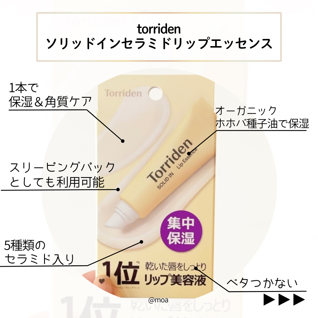 ⠀⠀@torriden_jpソリッドインセラミドリップエッセンス乾燥やカサつきが気になる唇にうるおい+角質ケア*¹もこれ一本で💛唇に乗せるととろけるようにするっと塗れる!ピタッと密着して、乾いた唇をしっとり保湿しつつもベタつかない使用感🫶🏼ス...