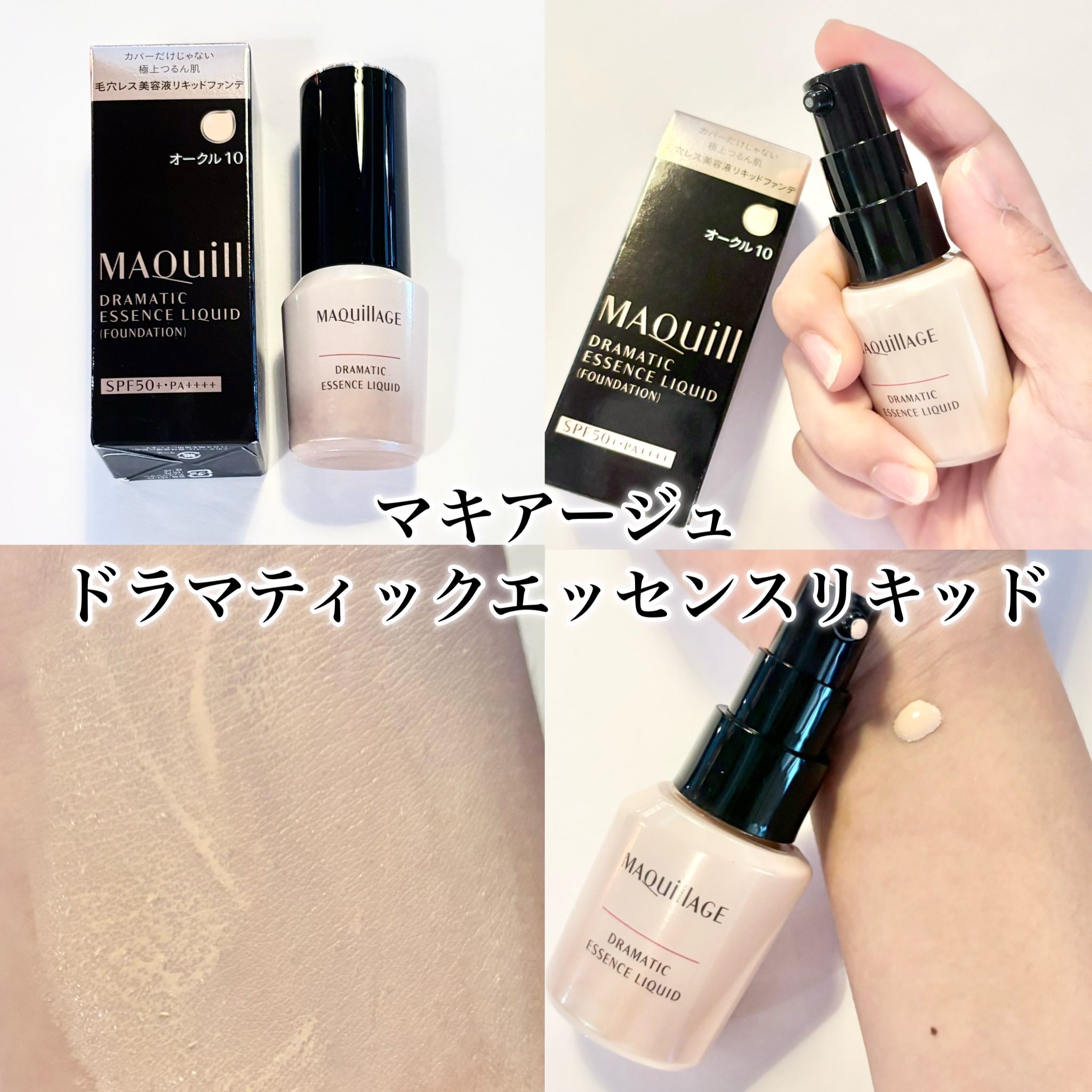 - カバーだけじゃない。極上つるん肌。毛穴レス美容液リキッドファンデ SPF50+・PA++++ ○乳化技術と美肌効果と浸透型美容液が三位一体となり、マキアージュ史上最高の美肌が叶うリキッドファンデーションです。 ① フルカバー×スキンケア乳化技術 └毛穴の凹凸にもピタッと密着。美容液を毛穴の奥まで届けながら、フルカバー ・保湿成分や油分のべたつきを感じさせず、なめらかな使用性を実現 ② ラスティング美肌効果 └毛穴・色ムラをフルカバーしながら、時間が経ってもくずれず、つけたての仕上がりが 長時間 持続 1 ・毛穴の凹凸を補正しながらつるんとした肌に見せる-毛穴レスつやパウダー ・カバーと透明感を同時に叶える-360 °美肌パウダー ・マスクをしていてもくずれにくい-ラスティングコート成分 ※1 13 時間化粧もち 毛穴の目立ちのなさ・つや・透明感・カバー力・化粧くずれのなさ データ取得済み 当社 調 べ。効果には個人差があります。 ③ 浸透型うるおい美容液 └長時間保湿持続。毛穴の奥までうるおいを届ける-グリシルグリシン ・グリセリン 整肌・保湿 ・たっぷりのうるおいで満たしつやのある肌に-ウォータリーキープエッセンス (ウォーターリリーエキス・スーパーヒアルロン酸(アセチルヒアルロン酸Na)・水溶性コラーゲン・グリセリン) 配合 ○1 回の使用量が分かりやすいディスペンサータイプです。 ○無香料、 ノンコメドジェニック・アレルギーテスト済 (全てのかたにニキビができない・アレルギーが起きないというわけではありません)