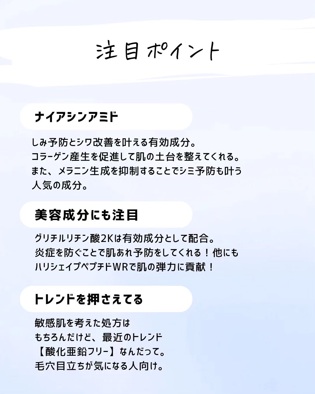 特定の有効成分を試してみたい。美容成分を試したい。そんな時は代用してもいいけど、それって似てるのかな?って思うときが正直ある。 同じ成分があっても実は濃度が違ったり、処方技術が違ったり。技術が違うと使用感も剤型も変わることがあることは知ったうえで使うといいかも。 せっかくプチプラ化粧品を買うならそれはそれで楽しんでほしいから是非念頭にいれてほしいな!!