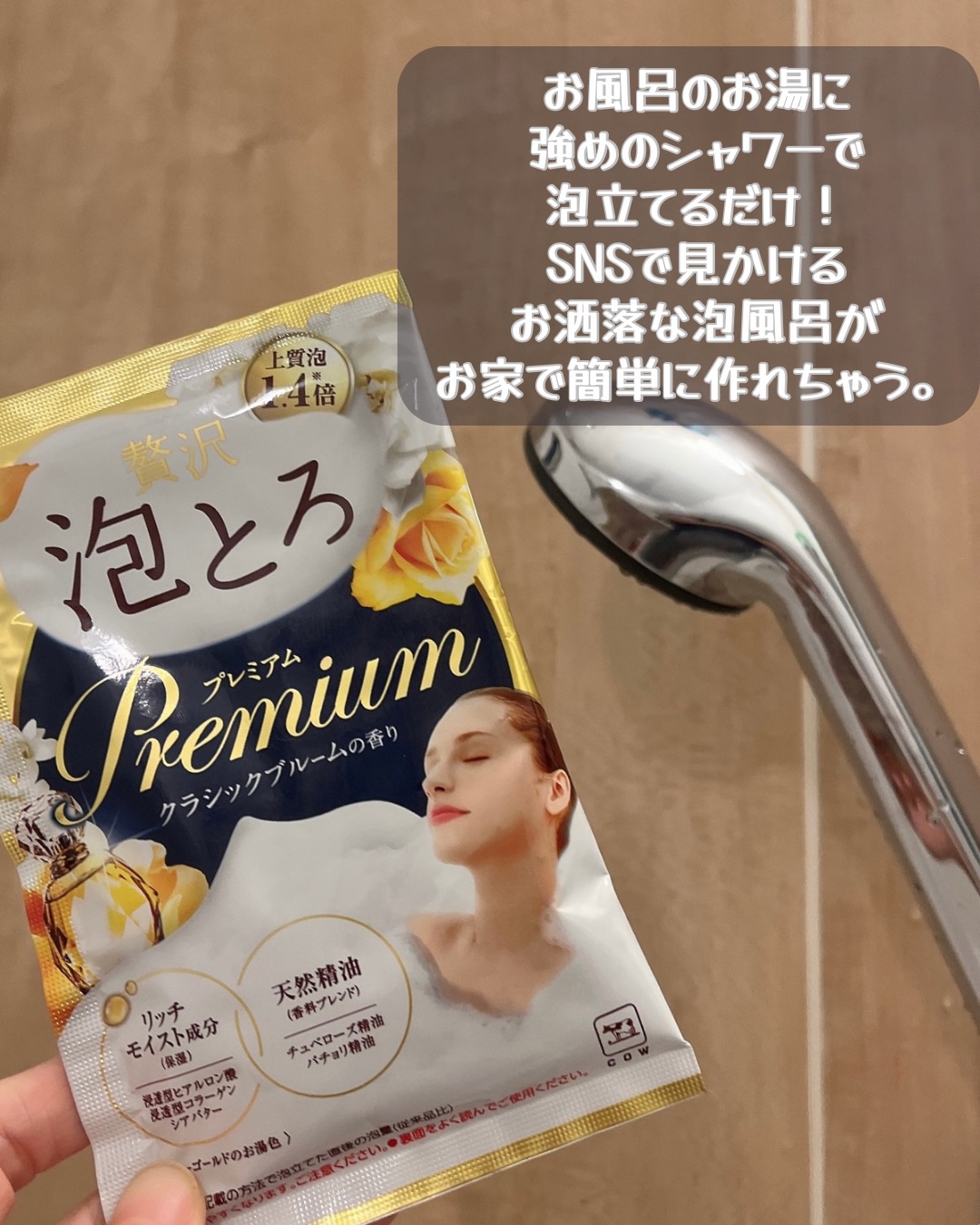 贅沢泡とろプレミアム入浴料 クラシックブルームの香り この「泡とろプレミアム」は通常の1.4倍の泡が作れるらしい!😳 香りは調香師と共同開発しているらしくて、ホワイトフローラルにアンバーが調和されているらしく高級感ある感じの好みの香りでした(*^^*)