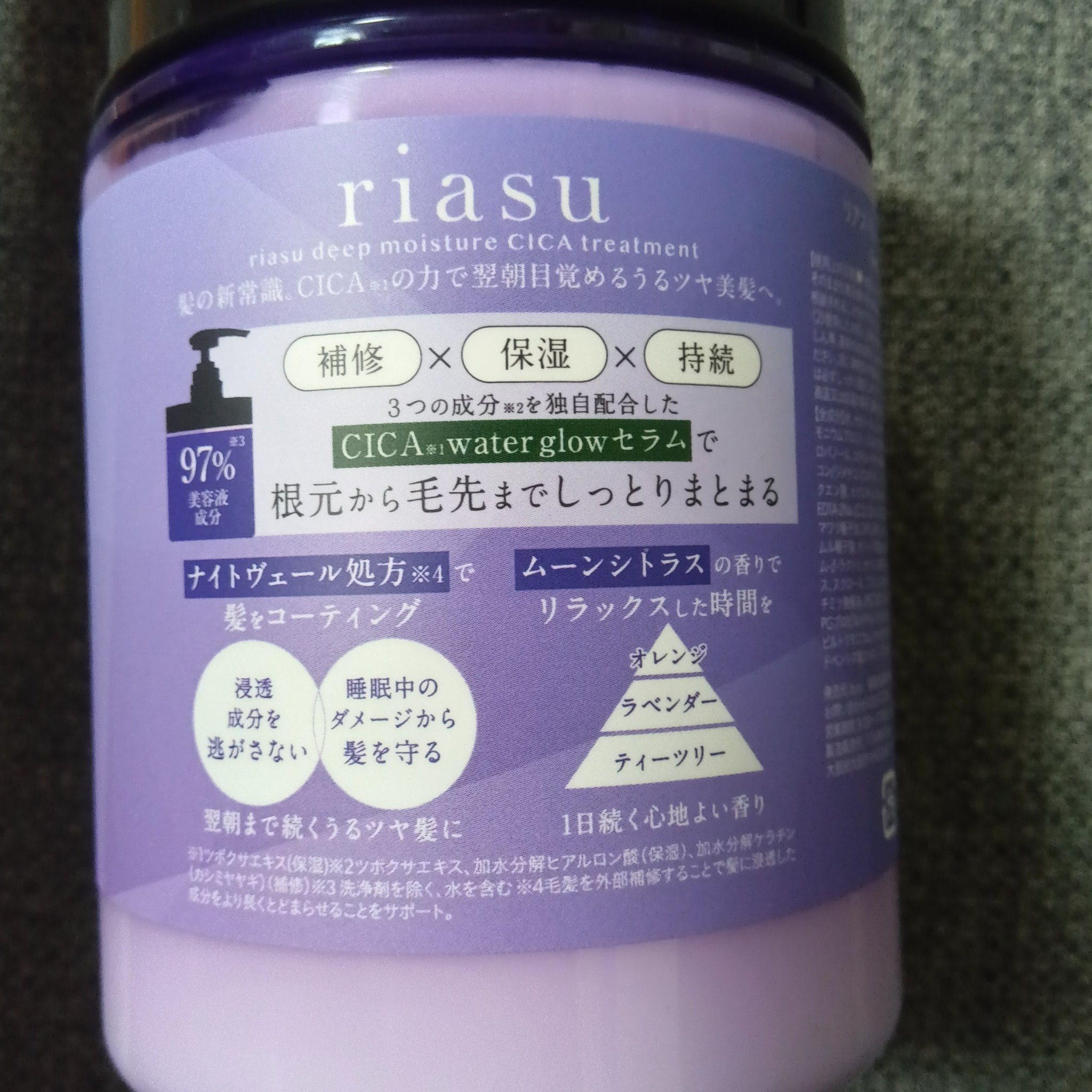 - ①独自のCICA water glowセラム ※3を新配合 使用感向上のために独自のCICA water glowセラム※3を新配合。CICA成分※2の力だけでなく、保湿やダメージ補修まで叶えるスペシャルなセラム成分です。 また、年齢と共に髪の悩みも多様化していく中で、頭皮と髪を同時にケアできるようにCICA water glowセラム ※3をはじめとした、頭皮環境を整える成分を配合しています。 ②ナイトベール処方で眠る時間をケアタイムに 眠る前にしっかりとヘアケアをしても、睡眠中に髪から成分が逃げてしまったり、枕や髪同士の摩擦によってダメージを与えてしまうと満足のいかない仕上がりになることも。 riasu deep moisture CICA shampoo & treatment 独自のナイトベール処方で、浸透した成分の持続をサポートし、さらに摩擦から髪を守ります。充実のケア成分だけでなく、そのケア成分の力を余すことなく感じていただける処方です。 ③美容液成分94%以上配合。しっとりまとまる贅沢な仕上がりに 寝起きにより効果を体感いただくためにリニューアル後の製品はより保湿力を高めた処方となっております。洗い上がりだけでなく、翌朝までしっとりまとまる扱いやすい髪へと導くヘアケアをお楽しみください。 また、髪がきしむとのお声を一部いただき、メインの洗浄成分をアミノ酸系の洗浄成分に変更いたしました。 ※1…デイリーランキング 2023/1/30更新 2023年1/19集計 ※2…ツボクサエキス(保湿) ※3…ツボクサエキス(保湿)、加水分解ヒアルロン酸(保湿)、加水分解ケラチン(カシミヤヤギ)(補修)