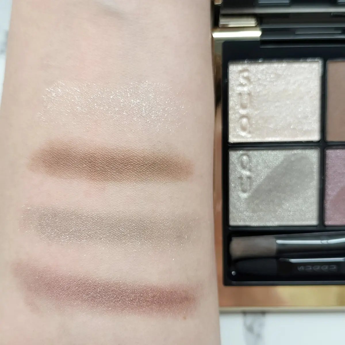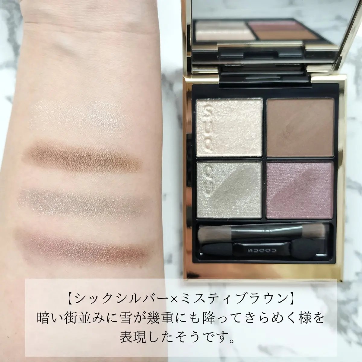 シックシルバーメミスティブラウン 右上ダークブラウンのマットカラーをベースに、(暗すぎないブラウン最高!) 繊細なキラキラ青ラメとパープルラメ入りとか反則かわいすぎ この完璧なベージュの輝きさすがSUQQU様 輝きの強いシルバーパールを配合。