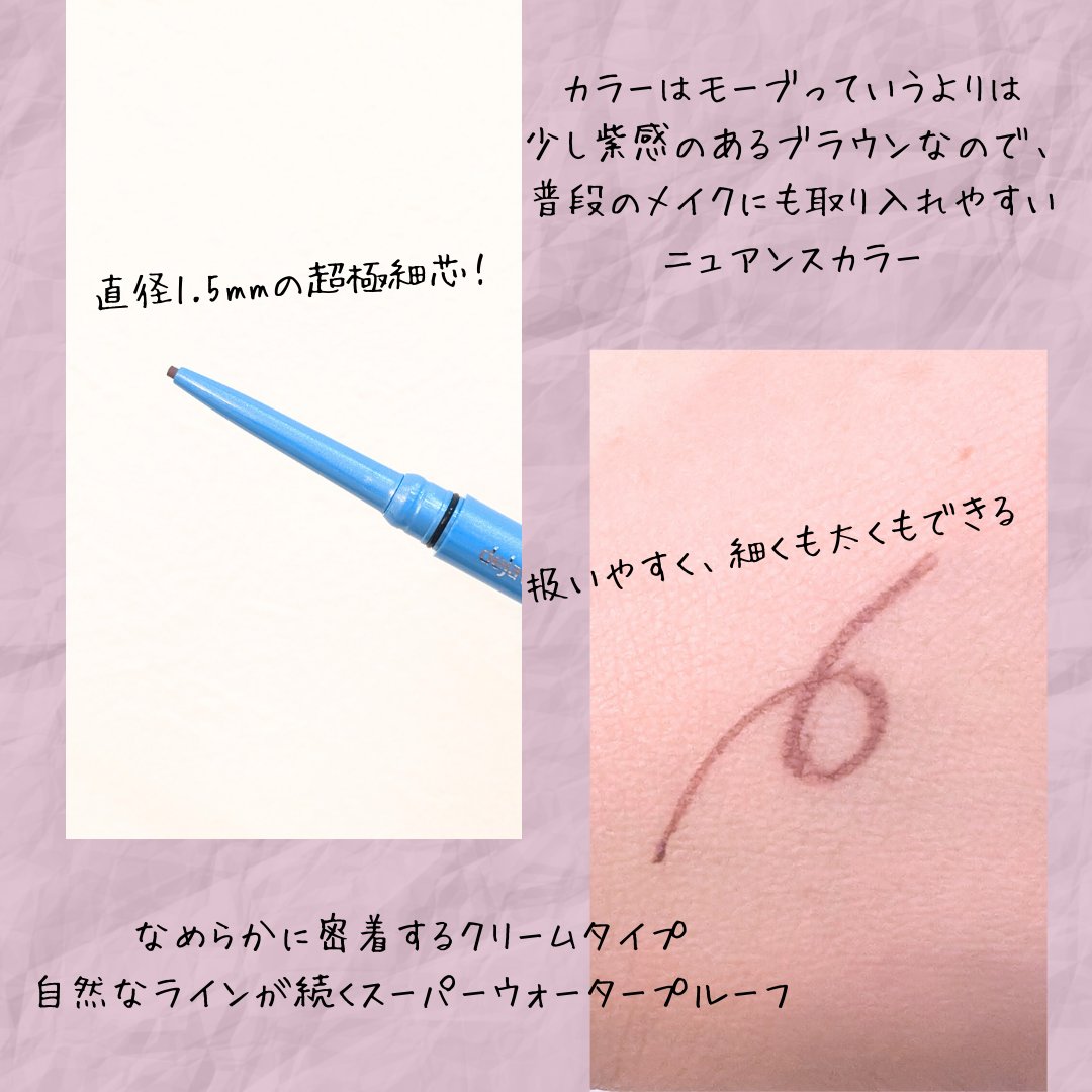 - ”なめらかなのに にじまない”クリームペンシル極細芯タイプ ・史上最細!*直径1.5㎜の超極細芯 ・自然なラインが長時間続く**スーパーウォータープルーフタイプ ・肌当たりが非常にやさしく、なめらかに描ける処方を採用 *ブランド内において **効果には個人差があります