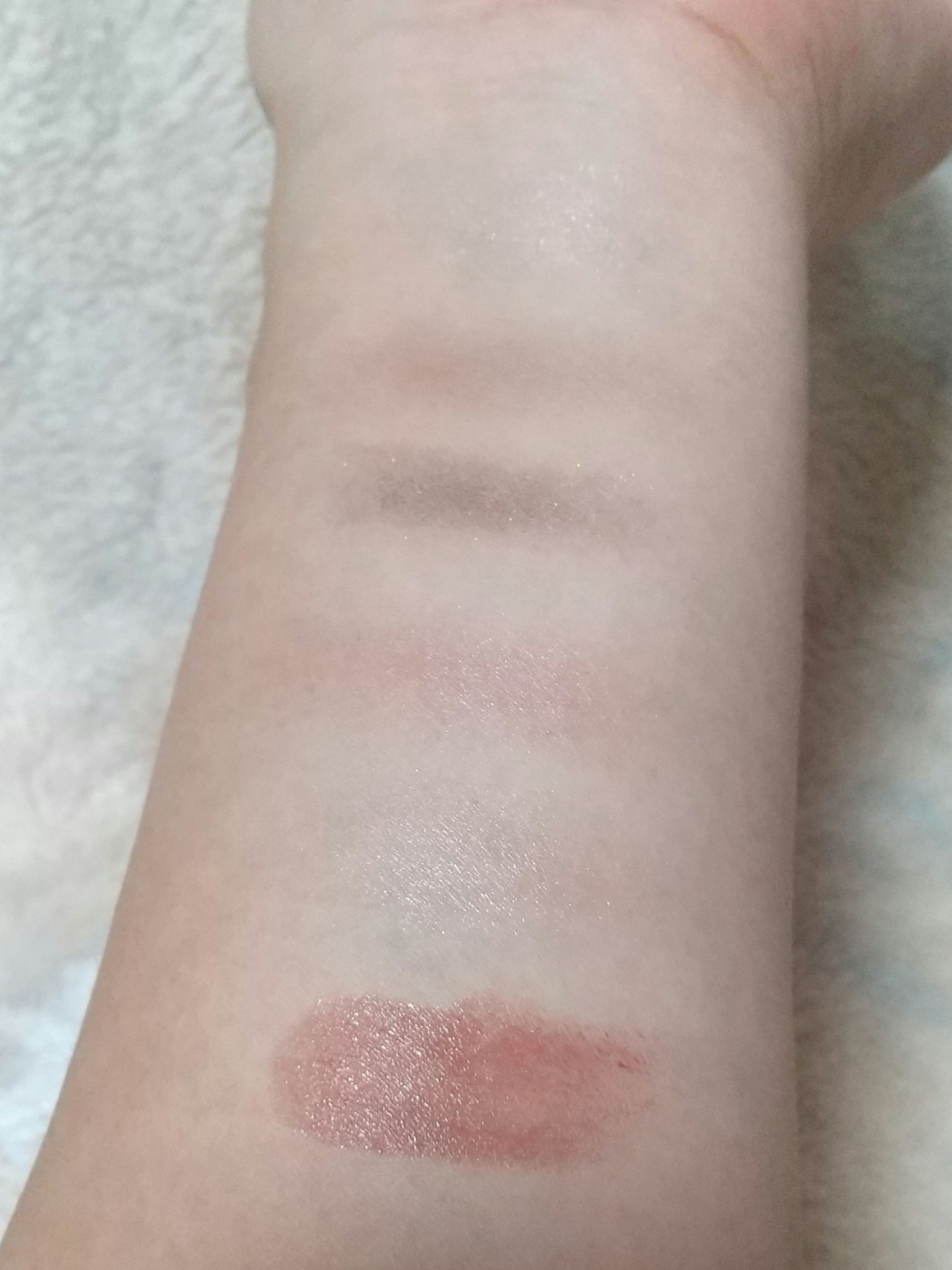 左上、左下、真ん中上、真ん中下、右上、右下という順番でスウォッチしてみました。 出してみると商品の写真より肌にのせたほうがくすみが出るかな✨という印象です😌 伸ばしやすくて指でも筆でもつけやすいです☺️💕 とっても可愛いカラーなのでオススメです💠