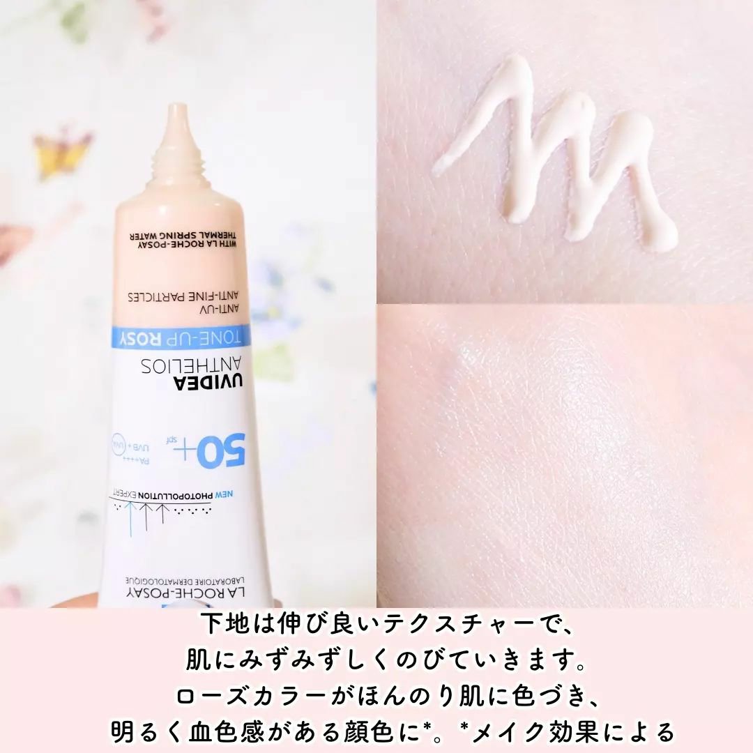 内側から発光してるみたいなツヤ感✨ 【ラ ロッシュ ポゼ/UVイデア XL プロテクショントーンアップ ローズ】 SPF50+/PA++++ スルスル滑らかに伸びる心地よいテクスチャー!! 密着感と保湿感があり、お気に入り◎ トーンアップローズはメイクアップ効果により、血色感を演出してくれる 仕上がりイメージです🌹