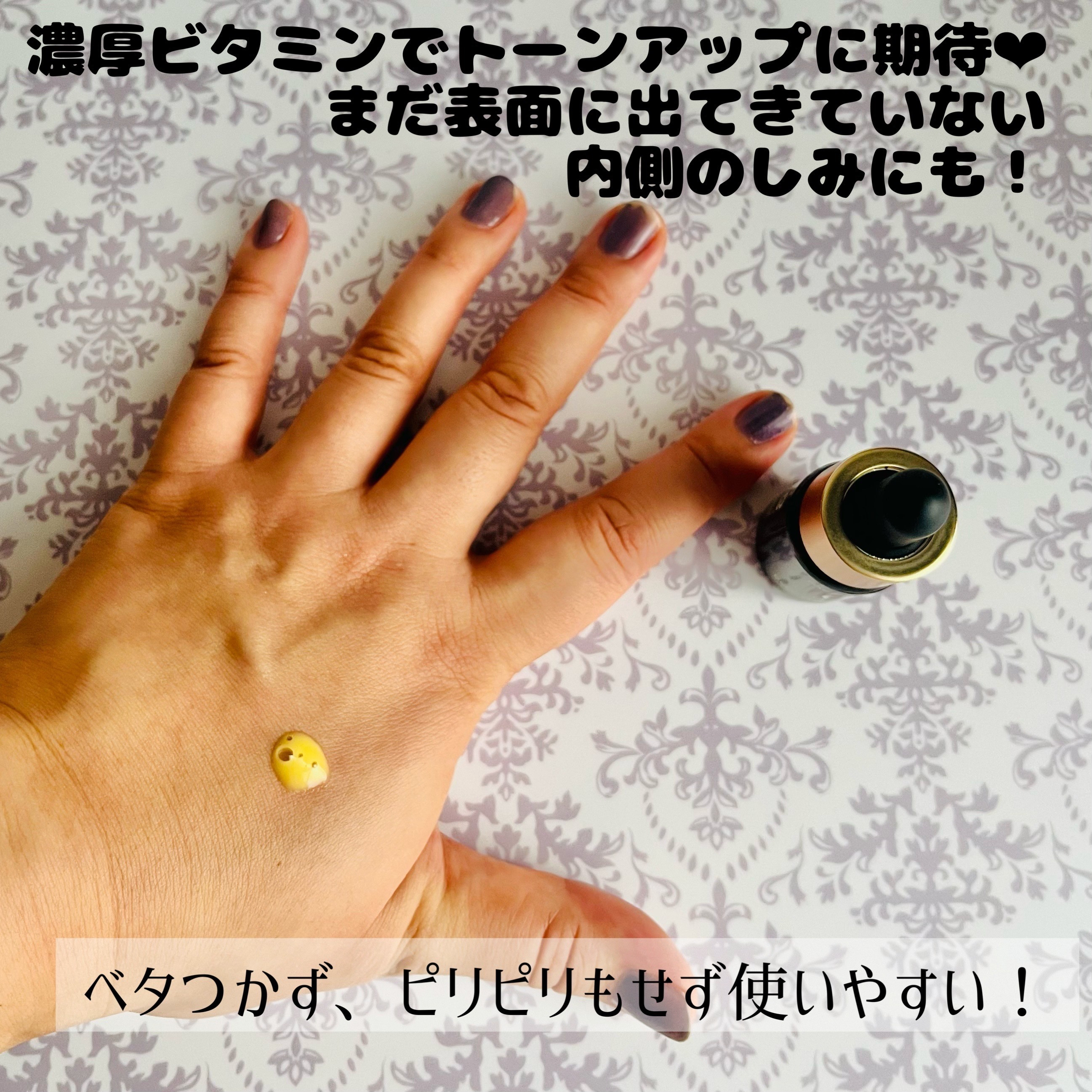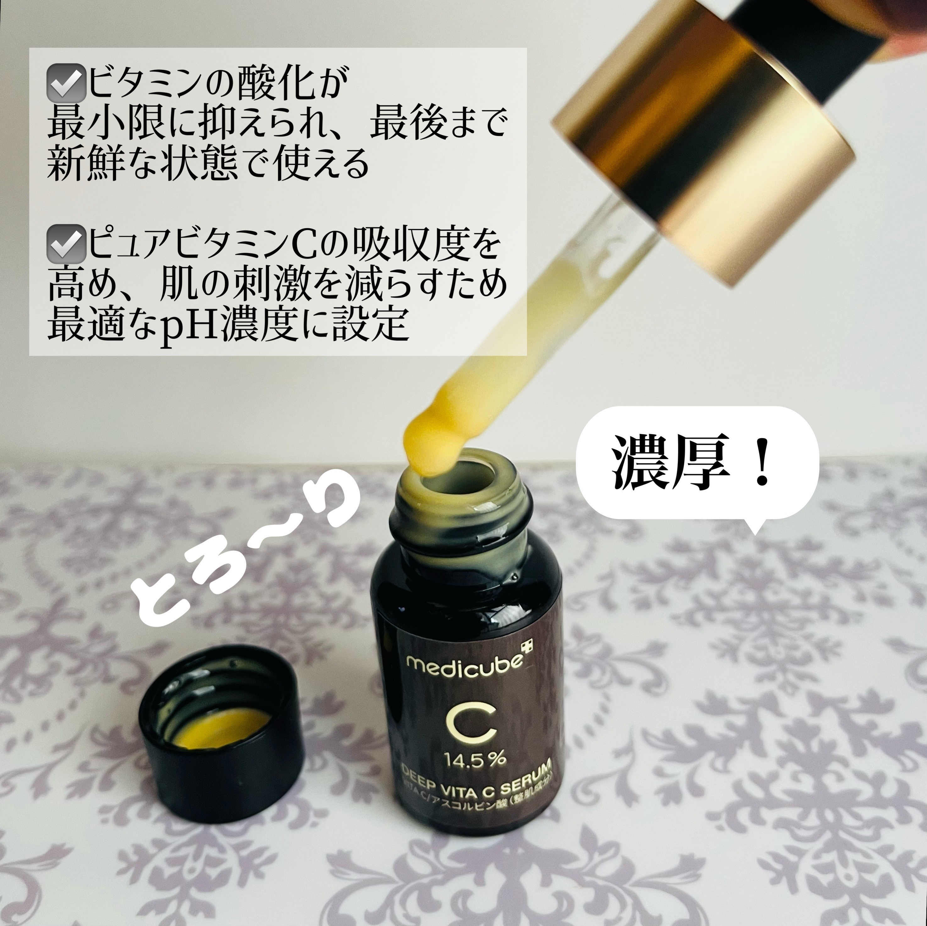 韓国🇰🇷ダーマコスメブランドの[medicube(メディキューブ)]のシミ消しケア。累計100万個販売突破の人気のアイテム! 7日間で肌がトーンアップすることが臨床試験で確認され、美白としわ改善もケアできる美容液✨ とにかく濃い! トロッと濃厚なのがわかります 高濃度ビタミンの証、独特の香りがします