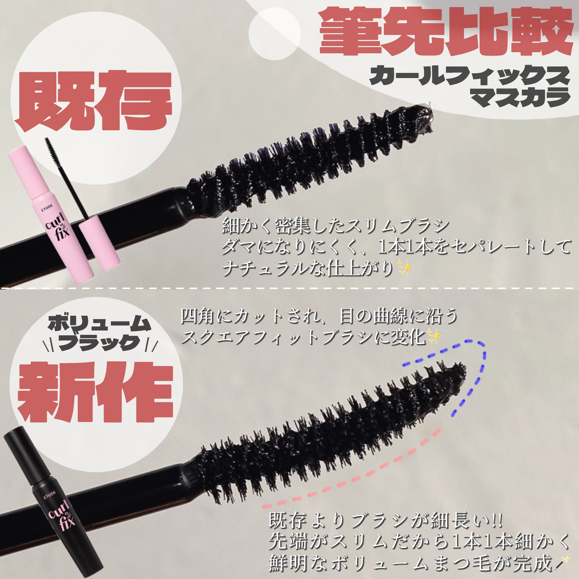 韓国8年連続No.1 カールマスカラより、待望の束感ボリュームタイプ誕生! 滲みにくいウォータープルーフ処方!涙や汗、皮脂にも負けない上向きまつ毛に。 一本で3役🌟カールキープ/ボリュームアップ/トップコート
