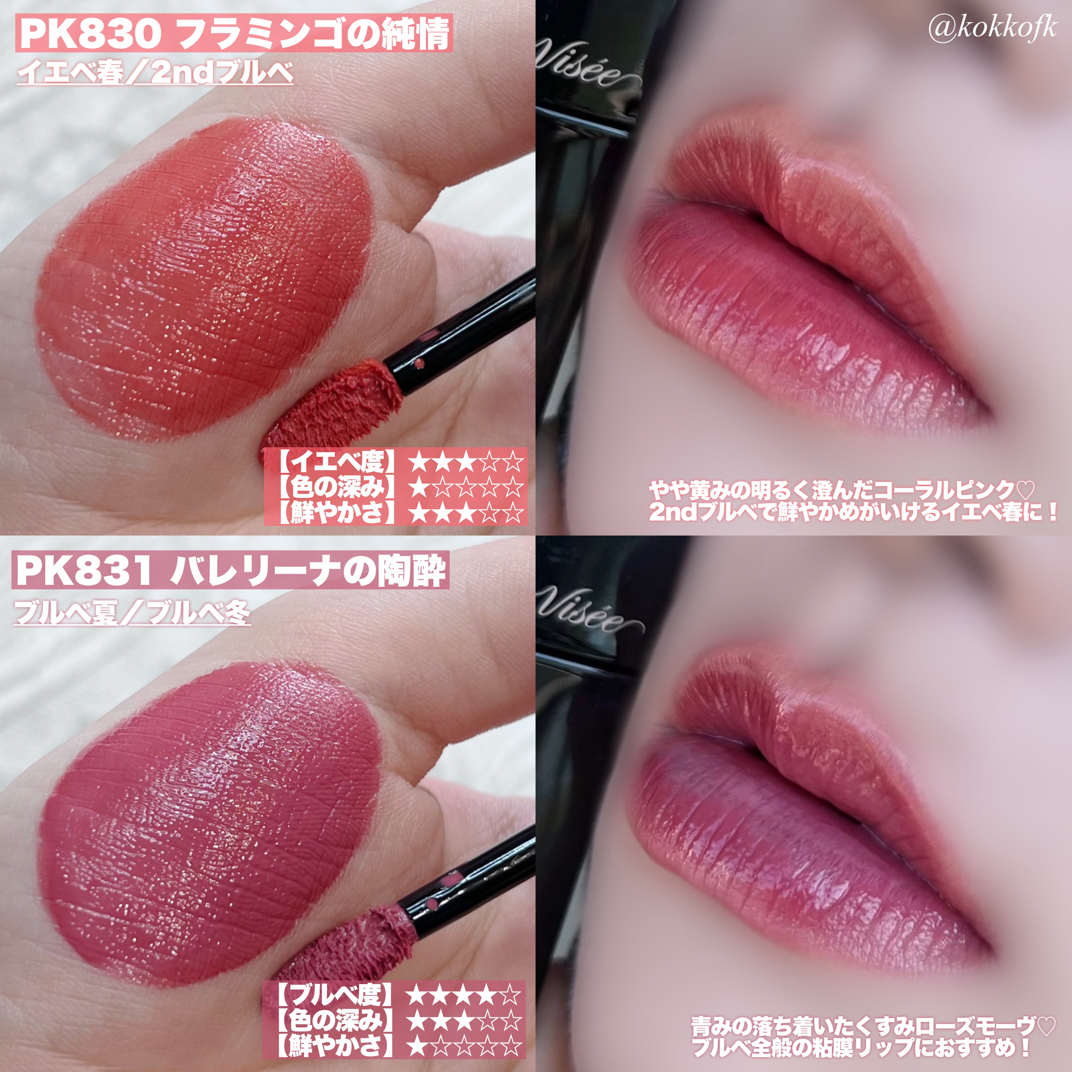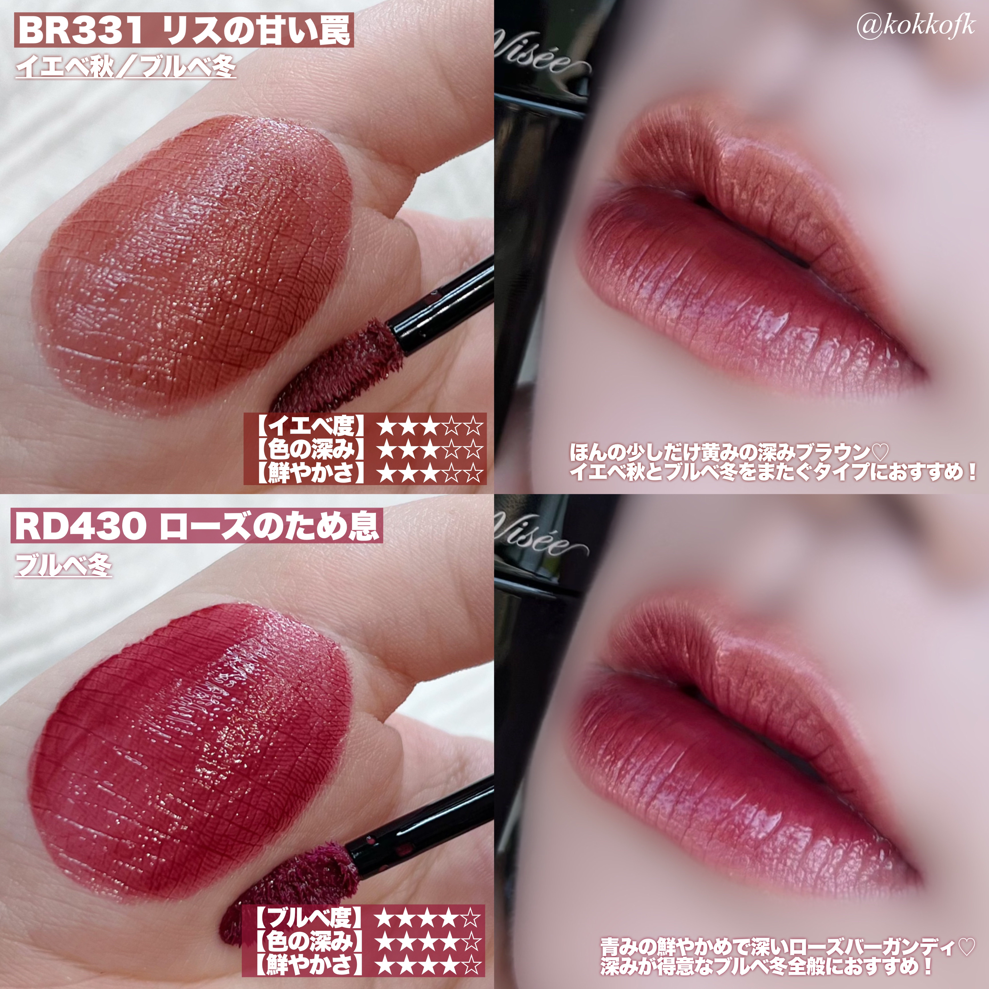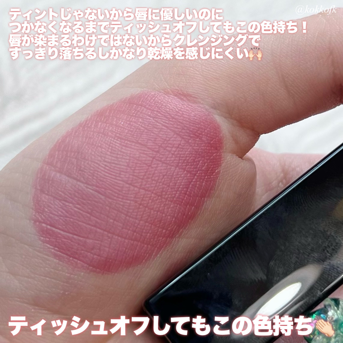 薄く唇に密着する新作マットティント。 マットなのにかなりしっとりとしていて 乾燥を感じなくてびっくりでした! 一気にこなれ感が出るトレンドカラーです♡ やや青みの華やかローズレッド 公式画像より鮮やかめに感じました。 やや黄みの強くて深いオレンジレッド ストロングオータムに超激推しです! やや黄みの非常に深く濃いダークブラウン ディープオータムに激推しです! かわいい雰囲気になれるピンクリップです♡ やや青みの柔らかいくすみピンクベージュ ミューテッドサマーにおすすめです! 青みの落ち着いたローズピンク やや青みのとても鮮やかなビビッドレッド ビビッドウィンターに特におすすめ! 既存マットティントよりもさらに ふわふわなマット感が魅力のリップで、 軽くティッシュオフしてもほとんど落ちない◎ マスクにも激推しのティントなので、 ぜひ皆さんもチェックしてみてね❤︎