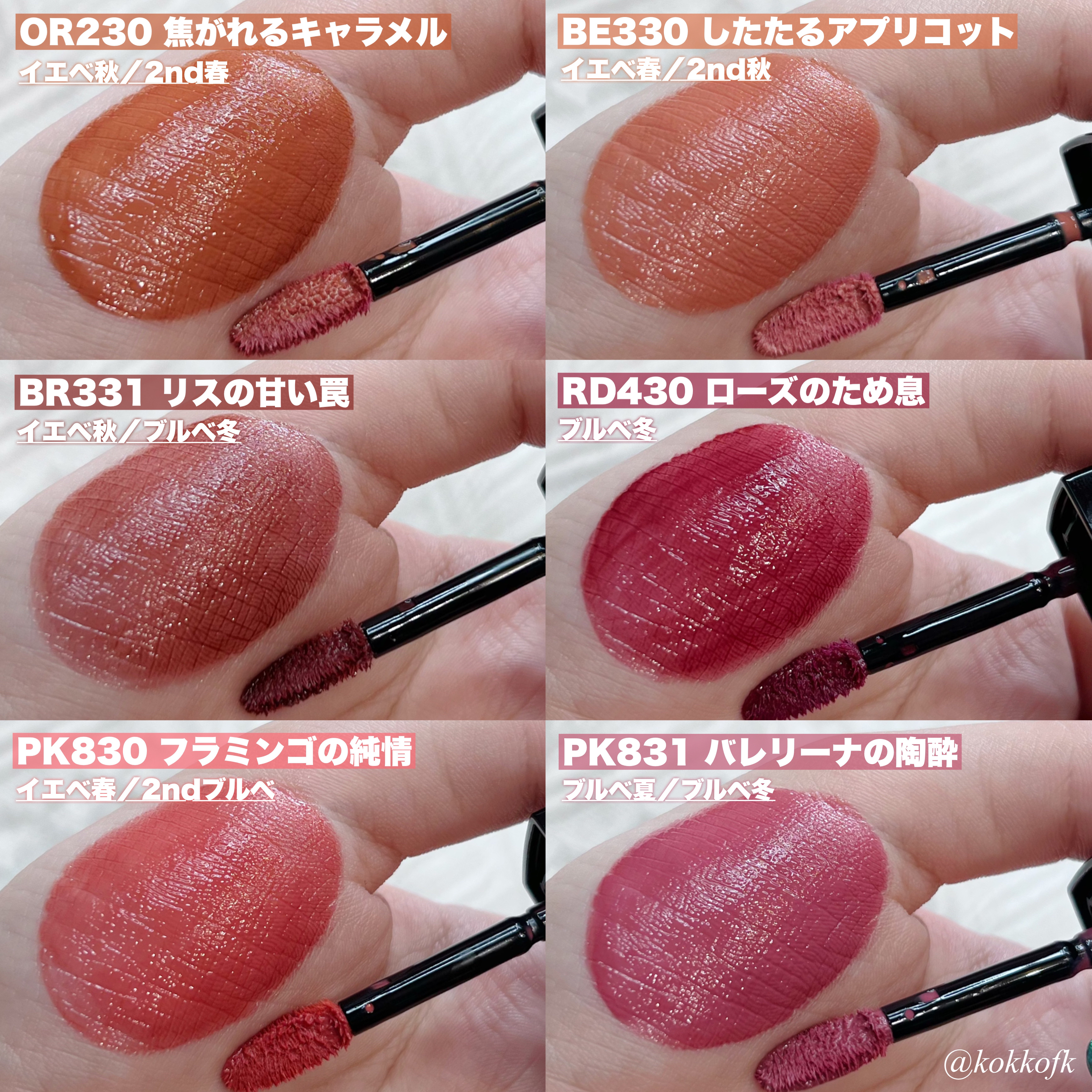 既存のジューシーラスティングティントよりさらに軽いツヤ感が魅力の新作ティント! 色選びの参考にしてね! やや黄みの明るいオレンジコーラル鮮やか得意なイエベ春におすすめ! 黄みの明るくまろやかなオレンジベージュ黄みが得意なイエベ春におすすめ! 青み黄み中間なくすみピンクベージュブルベ夏やイエベ春におすすめ 黄みの深くて鮮やかなオレンジレッド鮮やか得意なイエベ秋におすすめ! 青みの鮮やかで明るいビビッドピンク明るさ得意なブルベ冬やブルベ夏におすすめ! 青みの明るめで柔らかいローズピンクブルベ夏やブルベ冬におすすめ! 青み黄み中間な鮮やかで強いビビッドレッド2ndイエベ春のブルベ冬におすすめ! 青みの強い深くて鮮やかなベリーレッド2nd夏で鮮やか得意なブルベ冬におすすめ!