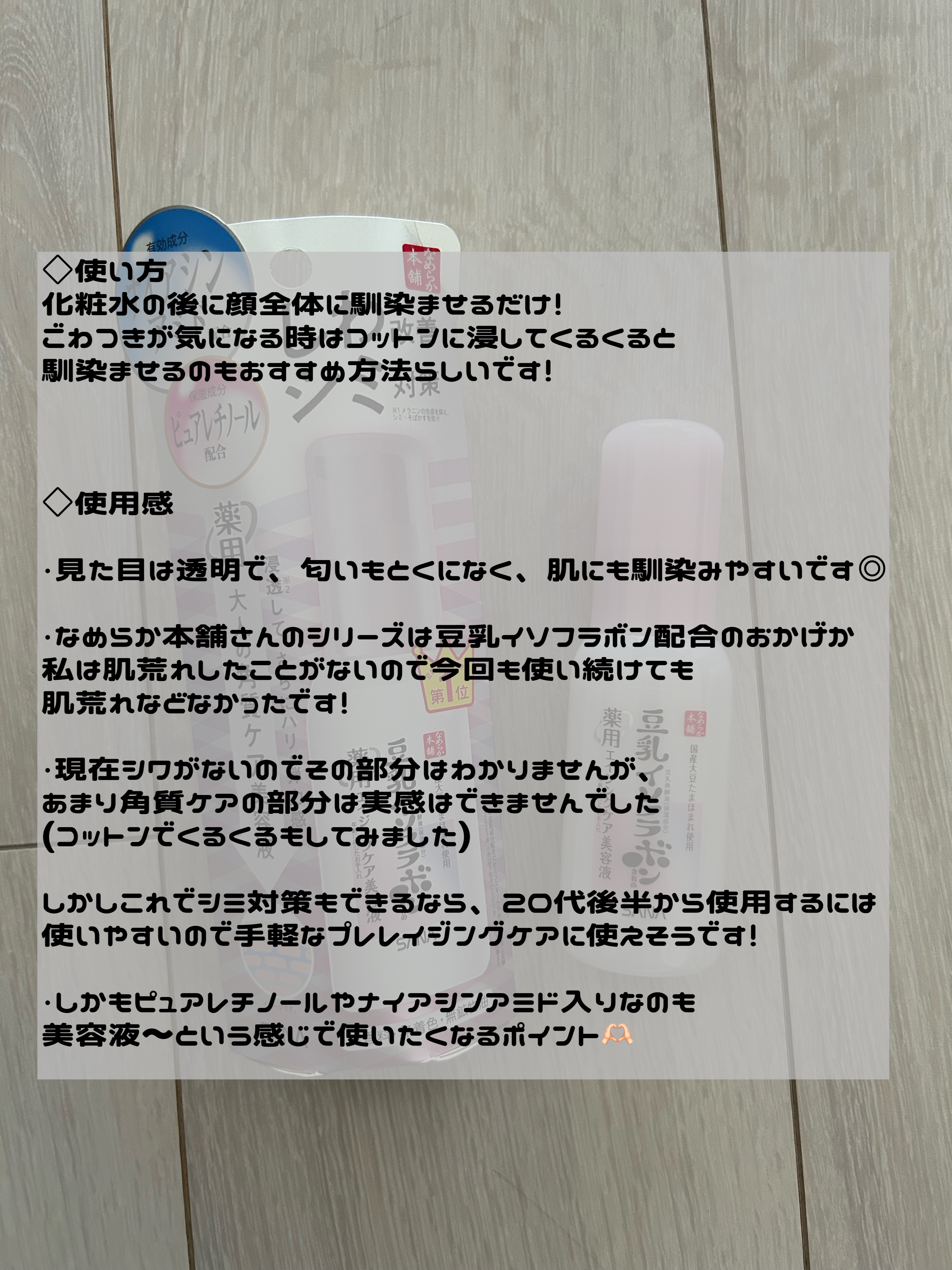 - 【医薬部外品】 浸透*1して、ハリ・弾力感 大人の角質ケア美容液 無香料・無着色・無鉱物油 豆乳発酵液含有の薬用エイジングケア*2美容液 しわ改善&シミ対策できる豆乳の角質ケア美容液 シミ対策:メラニンの生成を抑え、シミ・そばかすを防ぐ 有効成分ナイアシンアミドがお肌の奥まで届く! 角質にアプローチしながら、ハリ・透明感のある素肌へ。 乾燥が気になる大人のお肌に 乳酸(保湿成分):うるおいで角層をやわらかくなめらかに整えます。 豆乳発酵液(保湿成分):弾力感・うるおいを与え、ふっくらとした質感のお肌に。 ピュアレチノール(保湿成分):ビタミンAの一種で、ハリのあるお肌に。 ナイアシンアミド(有効成分):しわを改善し、メラニンの生成を抑え、シミ・そばかすを防ぎます。 ごわつきが気になるときに・・・コットン使い! 洗顔後、化粧水の前にコットンに適量(3プッシュ程度)をとり、お顔全体にやさしくくるくると広げてなじませてください。 つるんとハリ・透明感! 国産丸大豆「たまほまれ」使用 なめらか本舗「エイジングケアライン」オリジナルの豆乳発酵液(保湿成分)は、国内で栽培された大豆「たまほまれ」を丸ごと使用して作られています。 なめらか濃縮製法でつくるオリジナルの豆乳発酵液 豆乳発酵液に使用している大豆は、遺伝子組換えなし大豆を使用しています。 ●パッチテスト済み ●アレルギーテスト済み (すべての方に皮フ刺激やアレルギーが起きないわけではありません。) *1角層まで *2年齢に応じたお手入れ