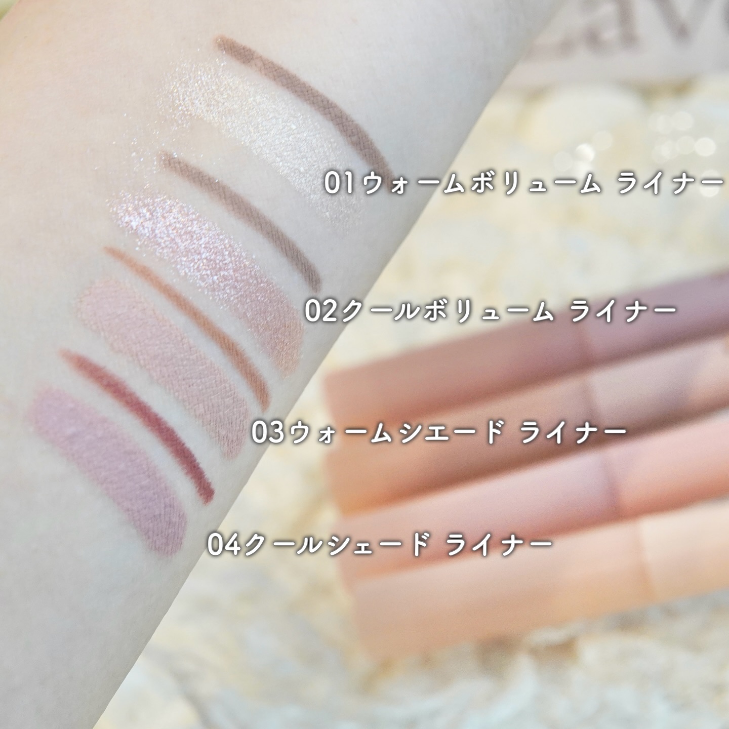 - 【01 ウォームボリュームライナー】 シャドウ:コチニール(カルミン)を使用しています。 【シャドウ】ジメチコン、フェニルトリメチコン、トリメチルシロキシケイ酸、合成ワックス、ステアリルジメチコン、マイクロクリスタリンワックス、テトライソステアリン酸ペンタエリスリチル、合成フルオロフロゴパイト、キャンデリラロウ、ホウケイ酸(Ca/チタン)、ホウケイ酸(Ca/Al)、シリカ、ジステアルジモニウムヘクトライト、フェノキシエタノール、イソステアリン酸ソルビタン、酢酸トコフェロール、炭酸プロピレン、酸化スズ、マイカ、酸化チタン、酸化鉄、カルミン 【ライナー】メチルトリメチコン、トリメチルシロキシケイ酸、ホホバ種子油、合成ワックス、マイクロクリスタリンワックス、ジメチコン、合成フルオロフロゴパイト、酸化鉄、シリカ、オクチルドデカノール、ポリブテン、ジステアルジモニウムヘクトライト、ポリヒドロキシステアリン酸、フェノキシエタノール、酸化チタン 【02 クールボリュームライナー】 シャドウ:コチニール(カルミン)を使用しています。 【シャドウ】ジメチコン、フェニルトリメチコン、トリメチルシロキシケイ酸、ホウケイ酸(Ca/チタン)、ホウケイ酸(Ca/Al)、合成ワックス、ステアリルジメチコン、マイクロクリスタリンワックス、テトライソステアリン酸ペンタエリスリチル、シリカ、キャンデリラロウ、ジステアルジモニウムヘクトライト、フェノキシエタノール、イソステアリン酸ソルビタン、酢酸トコフェロール、炭酸プロピレン、酸化スズ、マイカ、酸化チタン、酸化鉄、カルミン 【ライナー】メチルトリメチコン、トリメチルシロキシケイ酸、ホホバ種子油、合成ワックス、合成フルオロフロゴパイト、マイクロクリスタリンワックス、ジメチコン、シリカ、酸化鉄、オクチルドデカノール、ポリブテン、ジステアルジモニウムヘクトライト、ポリヒドロキシステアリン酸、フェノキシエタノール、酸化チタン 【03 ウォームシェードライナー】 【シャドウ】メチルトリメチコン、フェニルトリメチコン、トリメチルシロキシケイ酸、合成ワックス、ステアリルジメチコン、オクチルドデカノール、酸化鉄、キャンデリラロウ、ポリプロピルシルセスキオキサン、ジステアルジモニウムヘクトライト、合成フルオロフロゴパイト、シリカ、(エチレン/プロピレン)コポリマー、フェノキシエタノール、水酸化Al、セスキオレイン酸ソルビタン、トリエトキシカプリリルシラン、酢酸トコフェロール、トリ(カプリル酸/カプリン酸)グリセリル、メチコン、マイカ、酸化チタン 【ライナー】メチルトリメチコン、トリメチルシロキシケイ酸、ホホバ種子油、合成ワックス、マイクロクリスタリンワックス、ジメチコン、合成フルオロフロゴパイト、酸化鉄、シリカ、オクチルドデカノール、ポリブテン、ジステアルジモニウムヘクトライト、ポリヒドロキシステアリン酸、フェノキシエタノール、酸化チタン 【04 クールシェイドライナー】 ライナー:コチニール(カルミン)を使用しています。 【シャドウ】メチルトリメチコン、フェニルトリメチコン、トリメチルシロキシケイ酸、合成ワックス、ステアリルジメチコン、オクチルドデカノール、酸化鉄、キャンデリラロウ、ポリプロピルシルセスキオキサン、ジステアルジモニウムヘクトライト、シリカ、(エチレン/プロピレン)コポリマー、フェノキシエタノール、水酸化Al、セスキオレイン酸ソルビタン、トリエトキシカプリリルシラン、酢酸トコフェロール、トリ(カプリル酸/カプリン酸)グリセリル、メチコン、マイカ、酸化チタン 【ライナー】メチルトリメチコン、トリメチルシロキシケイ酸、ホホバ種子油、合成ワックス、マイクロクリスタリンワックス、合成フルオロフロゴパイト、ジメチコン、酸化鉄、シリカ、オクチルドデカノール、ポリブテン、ジステアルジモニウムヘクトライト、ポリヒドロキシステアリン酸、フェノキシエタノール、酸化チタン、カルミン