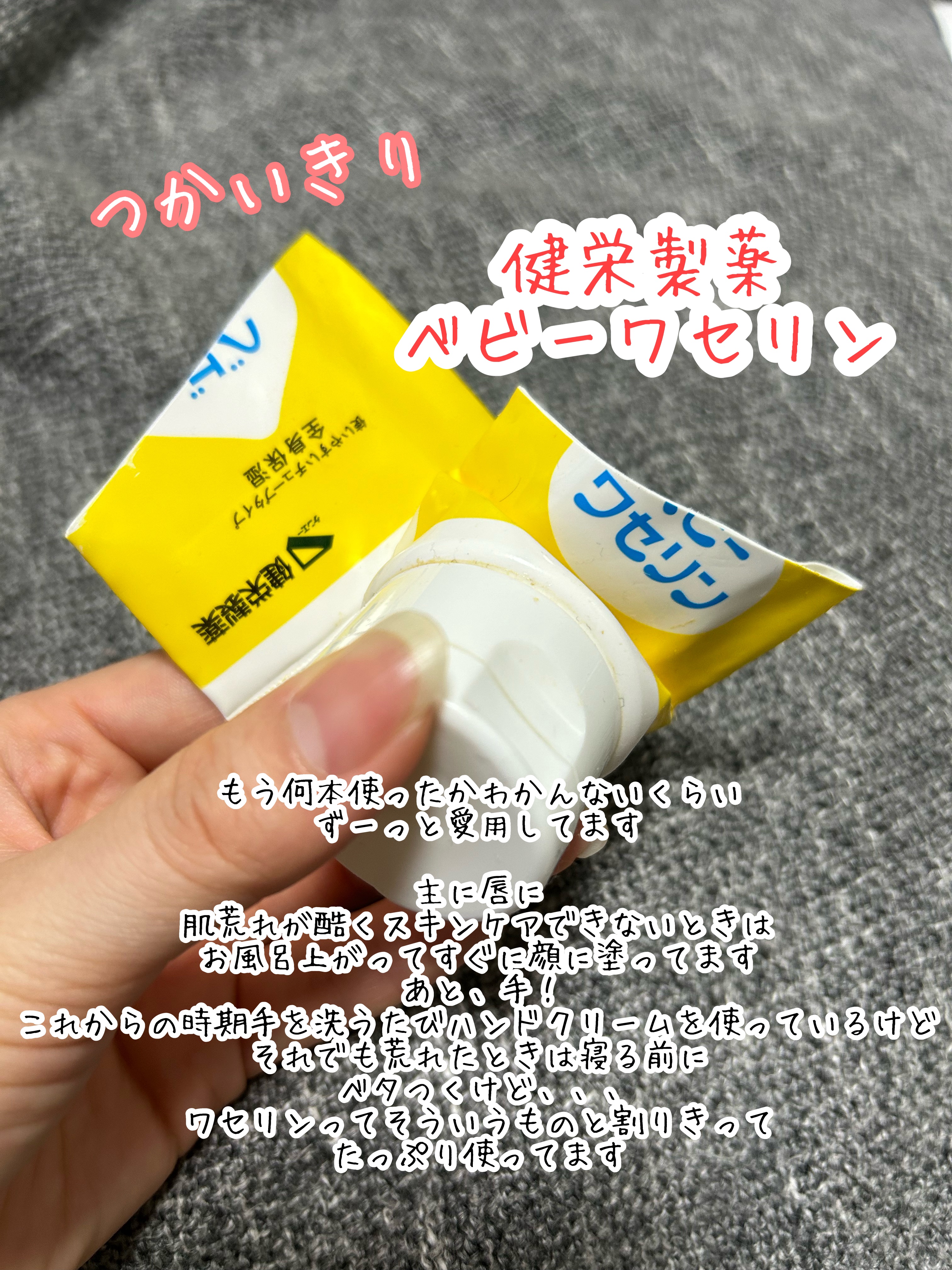 健栄製薬株式会社 ベビーワセリンリップを使用しました😊赤ちゃんなら大人まで使えるベビーワセリンリップになっております✨唇や皮ふを保護し、乾燥を防ぐワセリン(化粧用油)です。不純物が少なく、やわらかいので塗りやすいです。チューブの先端は斜めにカ...