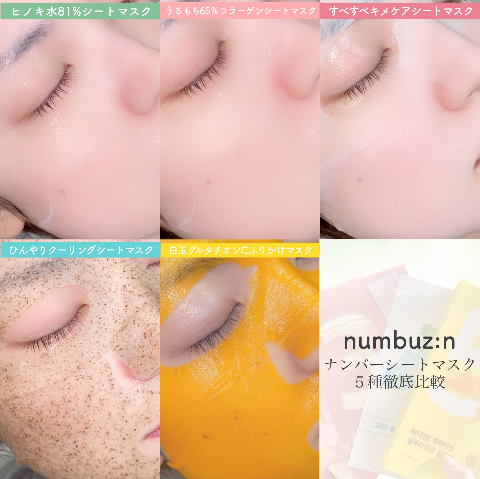 ナンバーズイン人気のパック5種使ってみたまとめ◎【numbuzin】💚1番ヒノキ水81%シートマスク驚きの糸引くパック。ヒノキの香りが心地良い〜🩷2番うるもち65%コラーゲンシートマスクゼリーみたいにぷるぷるなマスク。乾燥が気になるときに◎❤...