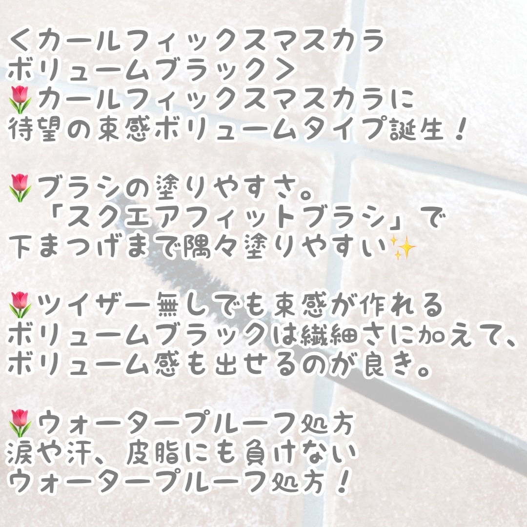 涙や汗、皮脂にも負けないウォータープルーフ処方で、どんな時もにじみにくい上向きまつ毛に 簡単にダマなしのまつ毛が作れる! そして、マスカラフィクサーとW使いするとカールもキープも出来る 一日まつげのカールも下がらずに 朝作ったまつ毛が夜まで綺麗にキープ👏