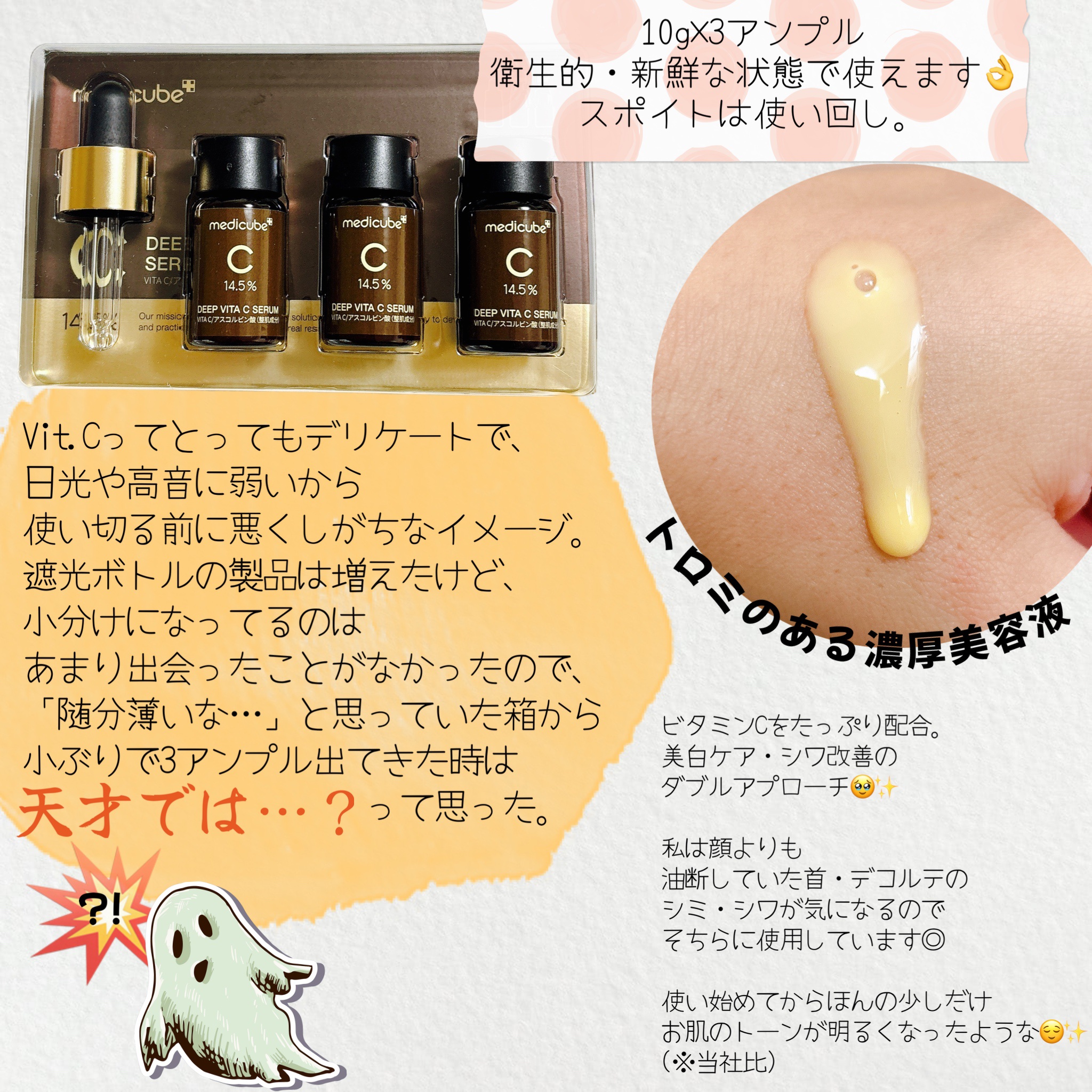 韓国🇰🇷ダーマコスメブランドの[medicube(メディキューブ)]のシミ消しケア。累計100万個販売突破の人気のアイテム! 7日間で肌がトーンアップすることが臨床試験で確認され、美白としわ改善もケアできる美容液✨ とにかく濃い! トロッと濃厚なのがわかります 高濃度ビタミンの証、独特の香りがします
