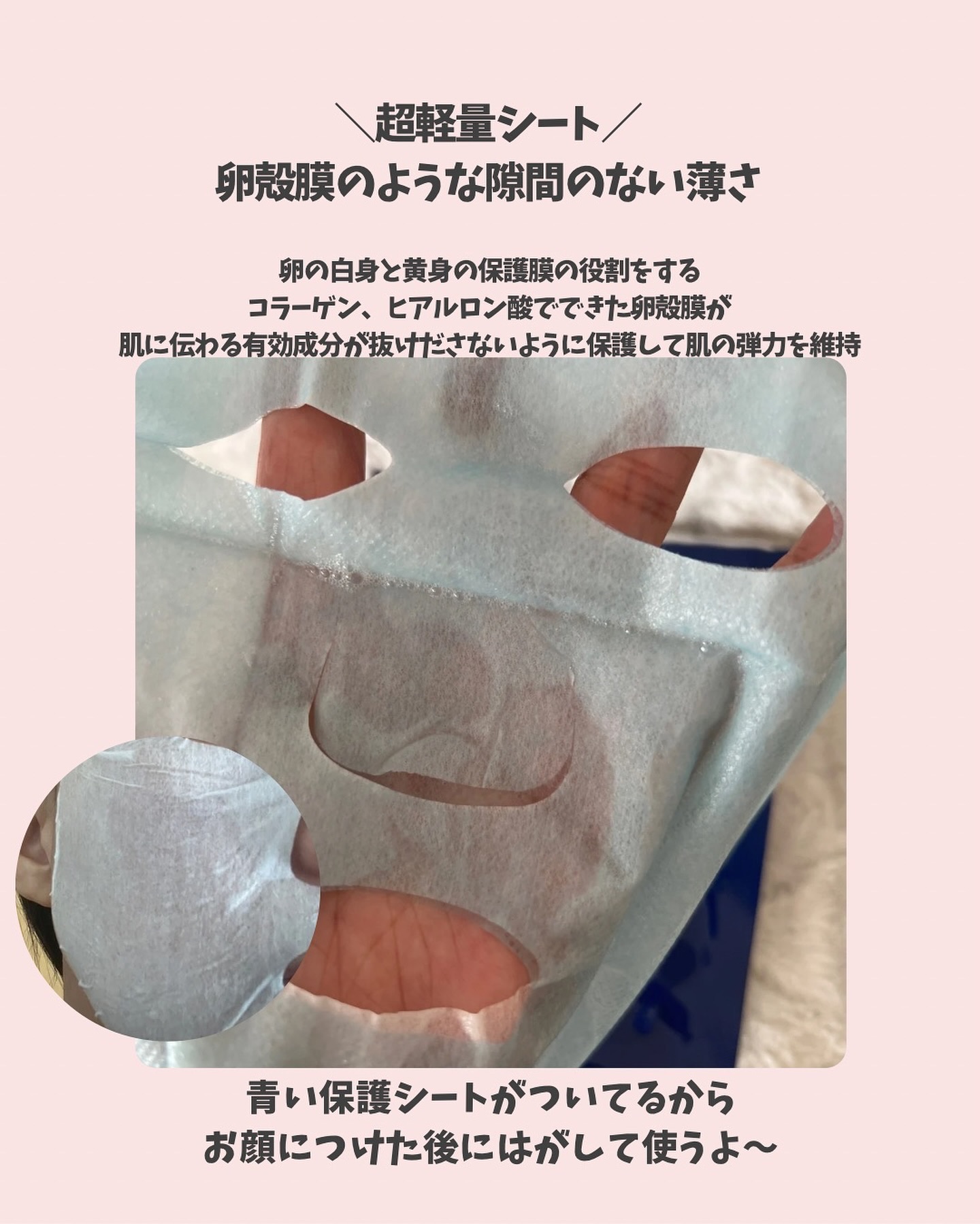 ぷるんぷるんなエッグリングマスク🥚 卵の卵殻膜成分を含んだ超繊細シートで肌への密着力◎薄い素材で貼りやすかった🙆 エッセンスもたっぷりだったよ✨ Qoo10メガ割でお得に購入できるから、チェックしてみて🤗
