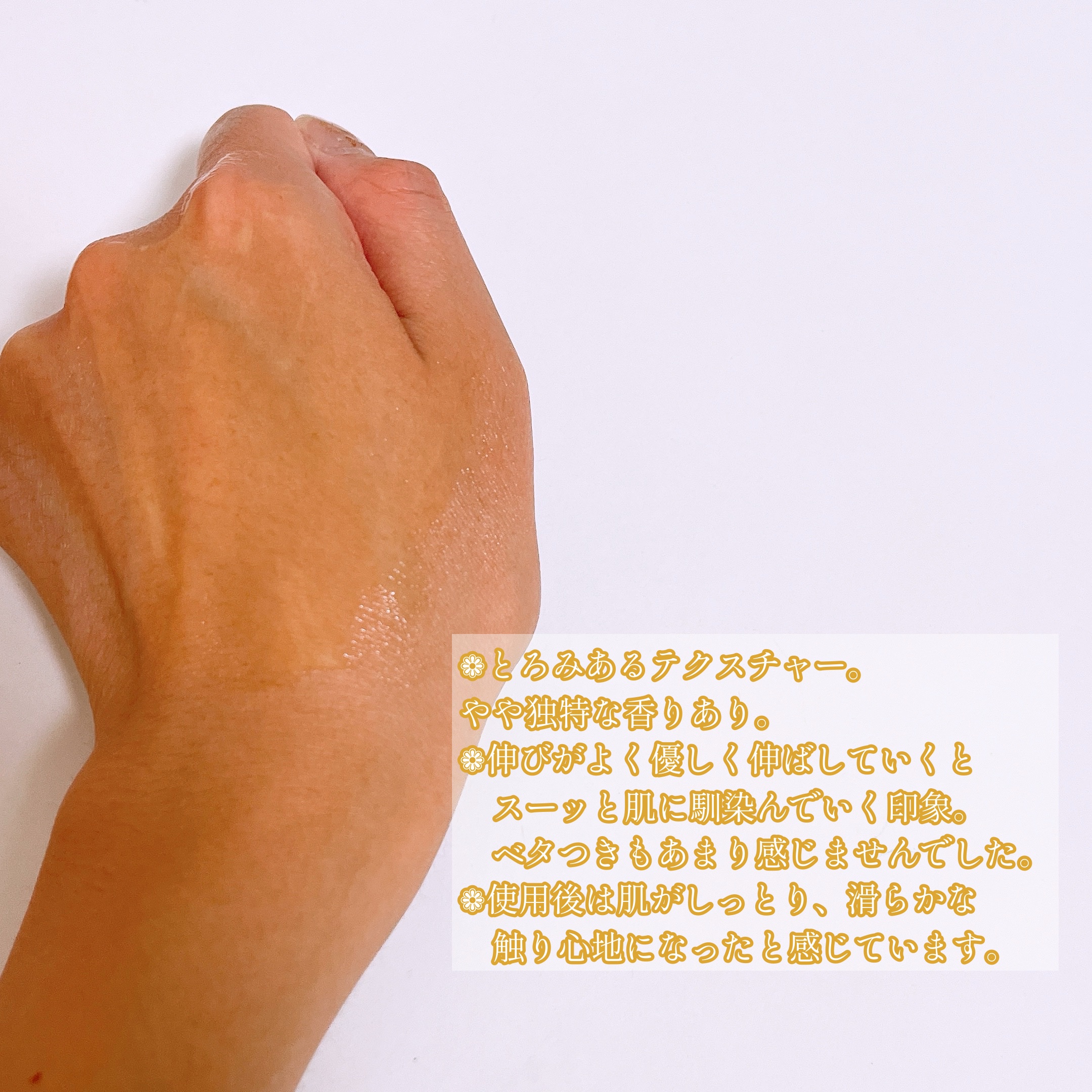 ❁ぷるぷるなテクスチャー。中に粒が入っています。 ゆっくり肌に馴染んでいく印象。 ❁保湿力が高いと感じます。塗ったところは殆ど 肌への乾燥を気にすることなく過ごせます。 仕上がりは肌がしっとりもちっとします! ❁ベタつきが結構あるため塗って少しの間はやや ベタつきが気になります。 ベタつきが苦手な方は使いづらいかもしれません。