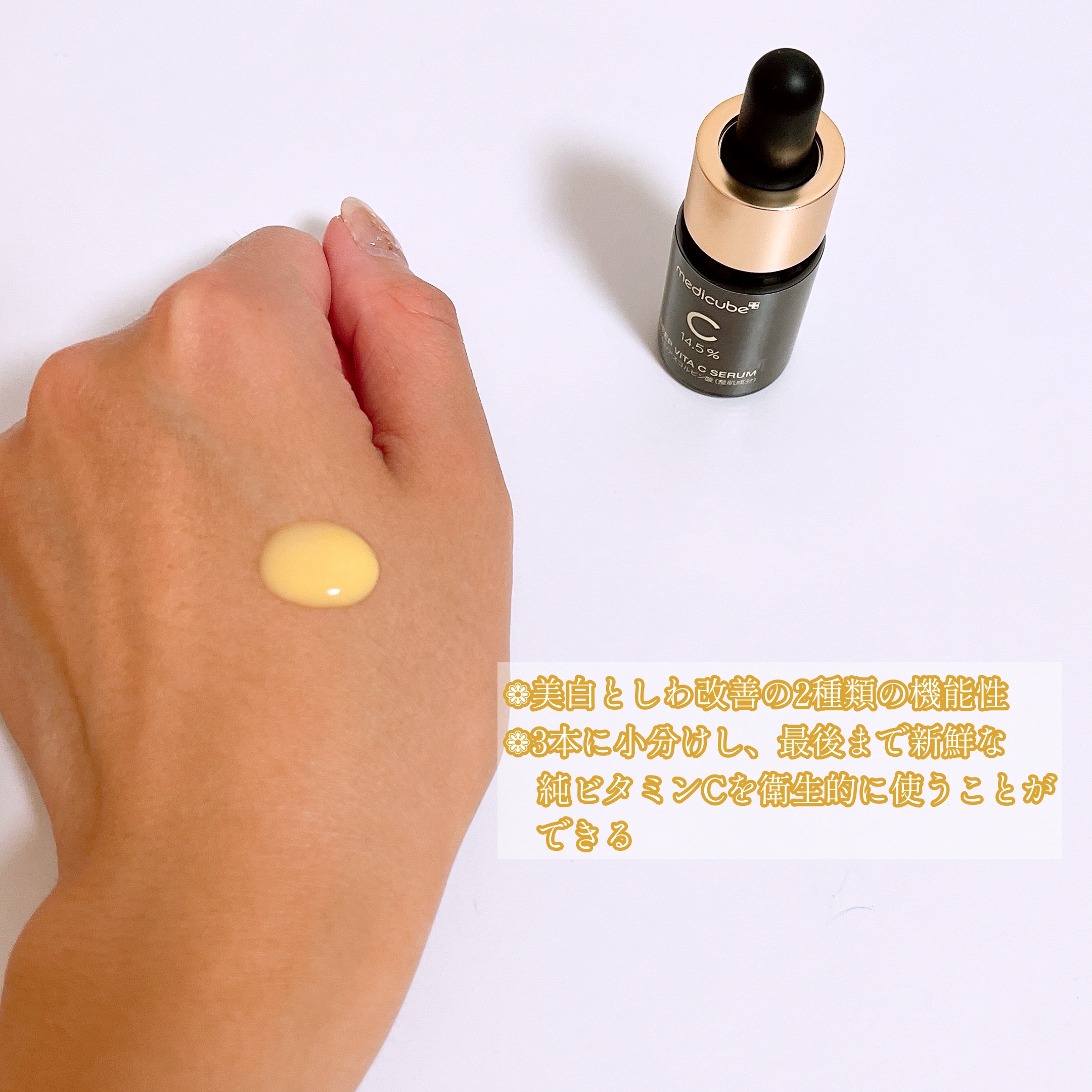 - 高濃縮のピュアビタミンC*やグルタチオン*をたっぷり配合した美容液です。 べたつかないテクスチャーで肌を保湿し、ツヤのある美肌に導きます。 ☑ピュアビタミンC* 145,000ppm配合 ☑独自整肌成分MELA-FADE ☑ナチュラルビタコンプレックス:カムカムの実エキス*・ビタミンツリーウォーター*・カカドゥプラムエキス*配合 ☑ビタミンの鮮度を維持するため、茶色の瓶3本に小分けしたパッケージを採用 ☑肌の角質層により浸透されやすい、こだわりのpH濃度(pH4.0以下)に設定 ☑乾燥によるくすみケア/弾力ケア/保湿ケア/肌キメケア 化粧水などでお肌を整えたあと、適量を取り、お肌のキメに沿ってまんべんなく塗った後、やさしくなじませます。 * 保湿成分 ■お肌に異常が生じていないかよく注意してご使用ください。化粧品がお肌に合わないとき即ち次のような場合には、使用を中止してください。そのまま使 用を続けますと、症状を悪化させることがありますので、皮膚科専門医等にご相談されることをおすすめします。また、傷やはれもの、しっしん等の異常が ある部位には、ご使用にならないでください。 (1)使用中、赤み、はれ、かゆみ、刺激、色抜け(白斑等)や黒ずみ等の異常があらわれた場合 (2)使用したお肌に、直射日光があたって上記のような異常があらわれた場合 ■目に入らないようご注意ください。目に入ったときは、こすらずにすぐに洗い流してください。その後、目に異常が残る場合は、眼科専門医へご相談され ることをおすすめします。 ■極端に高温又は低温の場所、低湿、高湿の場所、直射日光のあたる場所には保管しないでください。 ■衣類につくと、しみになることがございますのでご注意ください。 ■乳児、子供の手の届かない所に保管してください。