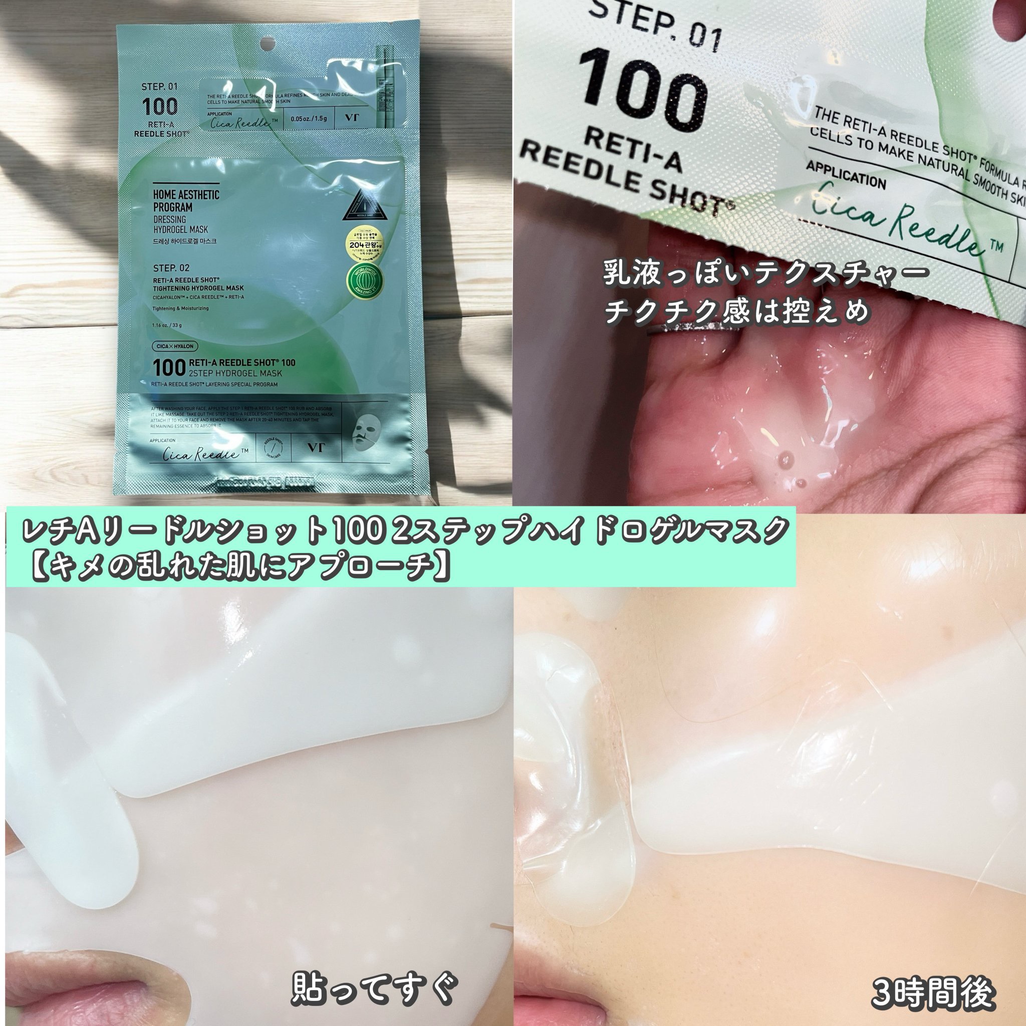肌馴染みに合わせて集中ナイトケア🌙 貼る美容液で理想の美肌を目指そう❤️ リードルショット100 2ステップハイドロゲルマスクは簡単2ステップ♡ ①上段はカラーリードルショット ②下段のハイドロゲルマスクを20〜40分後剥がします。 密着力がすごくて激しく動いてもぜんぜん剥がれなかった! 20分でもしっかり保湿されててお肌ひんやり気持ちいい💚