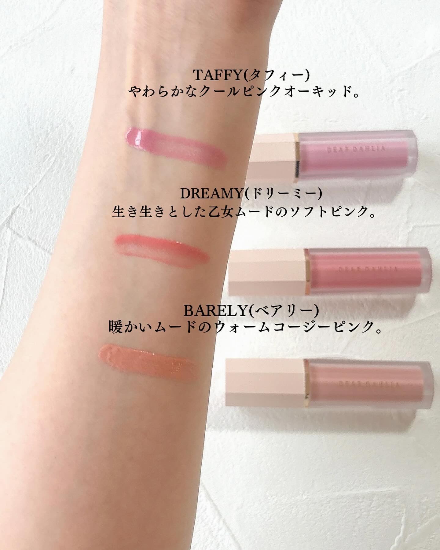 - ・花びらのような血色感をもたらすウォーターリキッドブラッシャー ・ウォータリーテクスチャーでツヤ感を出しながらナチュラルにレイヤリングが可能 ・持ち運びが便利でいつでも血色感をプラスできる ・チーク初心者でもナチュラルに発色するので安心! ・ダリア花抽出エキスのスキンコンディショニング作用によってお肌をケアしながらメイク可能。 ブルベオススメカラー/BARELY×TAFFY イエベオススメカラー/BARELY×DREAMY