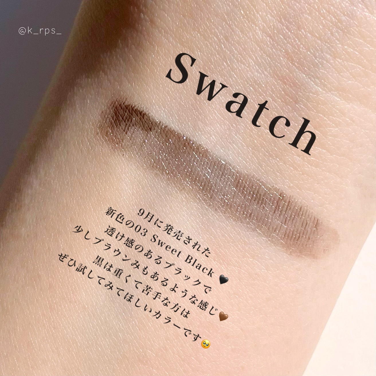 - <01 ブラック> イソドデカン、トリメチルシロキシケイ酸、マイクロクリスタリンワックス、(パルミチン酸/エチルヘキサン酸)デキストリン、クオタニウム-90ベントナイト、ポリブテン、パルミチン酸デキストリン、トリイソステアリン酸ポリグリセリル-2、ペンチレングリコール、炭酸プロピレン、フェノキシエタノール、トコフェロール、酸化鉄 <03 スウィートブラック> イソドデカン、トリメチルシロキシケイ酸、マイクロクリスタリンワックス、(パルミチン酸/エチルヘキサン酸)デキストリン、クオタニウム-90ベントナイト、ポリブテン、パルミチン酸デキストリン、トリイソステアリン酸ポリグリセリル-2、ペンチレングリコール、炭酸プロピレン、フェノキシエタノール、トコフェロール、酸化鉄、酸化チタン、水酸化Al