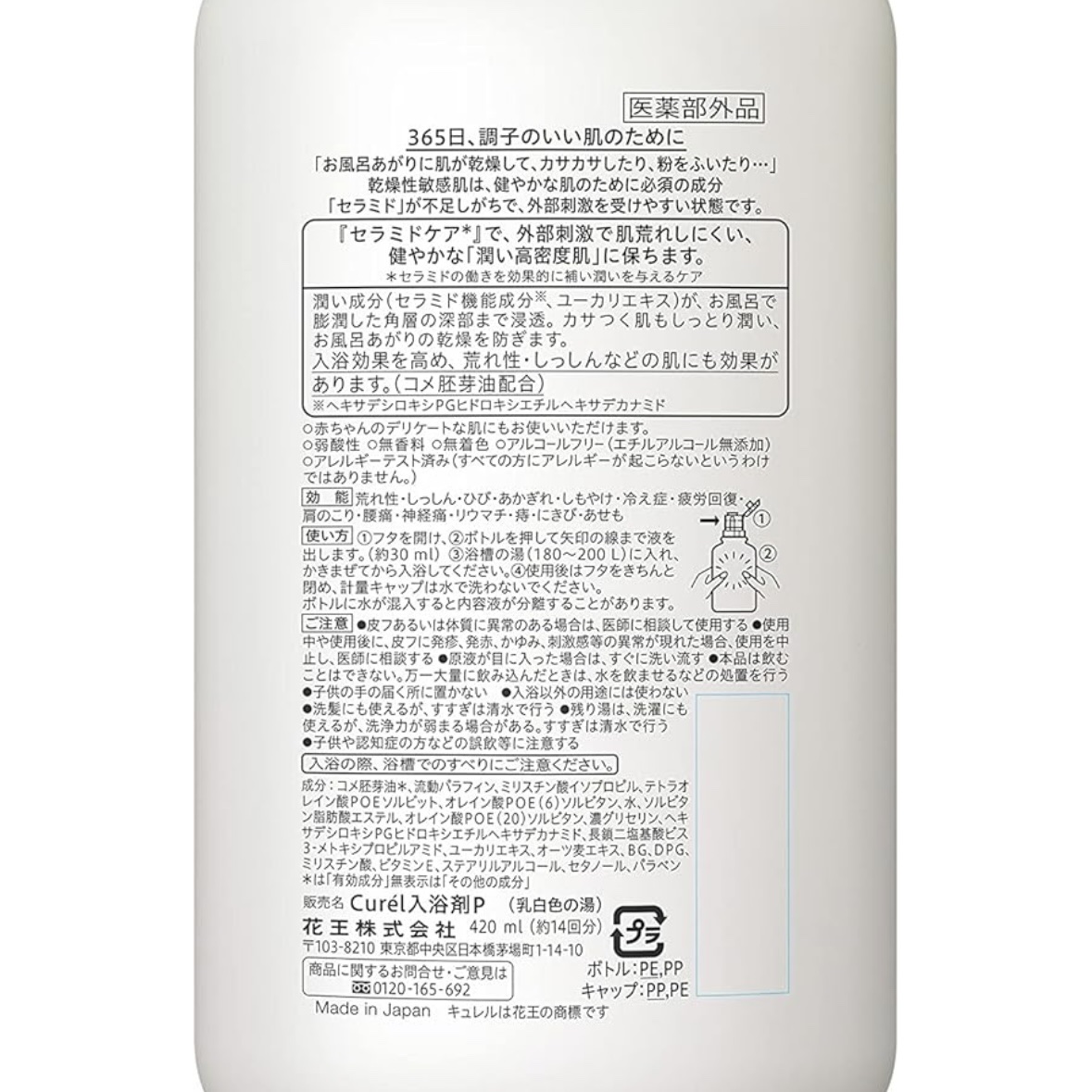 - 【敏感肌用】 ○潤い成分(セラミド機能成分*・ユーカリエキス)が、お風呂で膨潤した角層の深部まで浸透。カサつく肌もしっとり潤い、お風呂上りの乾燥を防ぎます。*ヘキサデシロキシPGヒドロキシエチルヘキサデカナミド ○入浴効果を高め、荒れ性・しっしんなどの肌にも効果があります。(コメ胚芽油配合) ○赤ちゃんのデリケートな肌にもお使いいただけます。 ○無香料・無着色・弱酸性・アルコールフリー (医薬部外品) 商品に関するお問い合わせ 受付時間9:00~17:00(土曜・日曜・祝日除く) *製品の誤飲・誤食など緊急の場合は、受付時間外でもお電話ください キュレル:0120-165-698