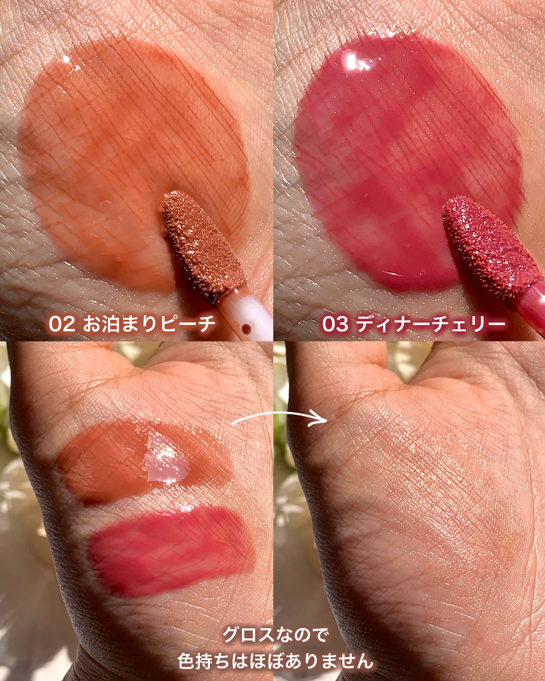 アクアベージュは 雫のようなブルーラメを閉じ込めた ヌーディな「水蜜桃リップ」 シマータンジェリンは 甘い蜜のようなゴールドラメをまとう まろやかな赤みオレンジ となっていて、どちらも春にピッタリな 可愛らしいカラーです🥰 アクアベージュは パソカ問わずに使いやすそうな 粘膜カラーとなっていて デイリー使いするなら断然こっちだと思います😊