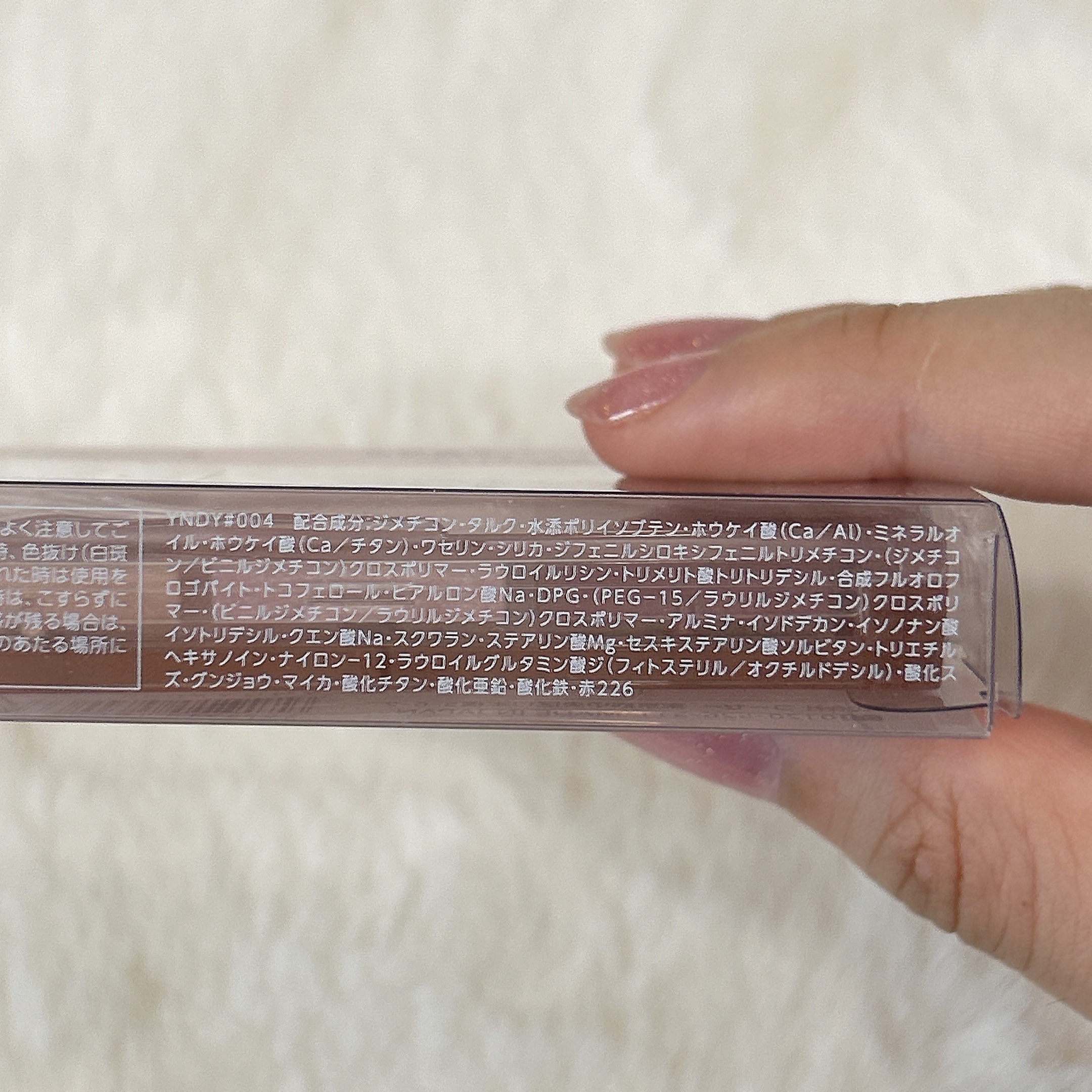 - <BR-1 無垢なまなざし> ジメチコン、タルク、水添ポリイソブテン、ホウケイ酸(Ca/Al)、ミネラルオイル、ホウケイ酸(Ca/チタン)、シリカ、ワセリン、ジフェニルシロキシフェニルトリメチコン、(ジメチコン/ビニルジメチコン)クロスポリマー、ラウロイルリシン、トリメリト酸トリトリデシル、トコフェロール、ヒアルロン酸Na、DPG、(PEG-15/ラウリルジメチコン)クロスポリマー、(ビニルジメチコン/ラウリルジメチコン)クロスポリマー、アルミナ、イソドデカン、イソノナン酸イソトリデシル、クエン酸Na、スクワラン、ステアリン酸Mg、セスキステアリン酸ソルビタン、トリエチルヘキサノイン、ナイロン-12、ラウロイルグルタミン酸ジ(フィトステリル/オクチルドデシル)、合成フルオロフロゴパイト、酸化スズ、水酸化Al、グンジョウ、マイカ、酸化チタン、酸化亜鉛、酸化鉄 <BR-2 惹きつける瞬き> ジメチコン、水添ポリイソブテン、ホウケイ酸(Ca/Al)、ミネラルオイル、タルク、ホウケイ酸(Ca/チタン)、ワセリン、シリカ、ジフェニルシロキシフェニルトリメチコン、(ジメチコン/ビニルジメチコン)クロスポリマー、ラウロイルリシン、トリメリト酸トリトリデシル、トコフェロール、ヒアルロン酸Na、DPG、(PEG-15/ラウリルジメチコン)クロスポリマー、(ビニルジメチコン/ラウリルジメチコン)クロスポリマー、アルミナ、イソドデカン、イソノナン酸イソトリデシル、クエン酸Na、スクワラン、ステアリン酸Mg、セスキステアリン酸ソルビタン、トリエチルヘキサノイン、ナイロン-12、ラウロイルグルタミン酸ジ(フィトステリル/オクチルドデシル)、合成フルオロフロゴパイト、酸化スズ、グンジョウ、マイカ、酸化チタン、酸化亜鉛、酸化鉄 <OR-3 陽だまりの瞳> ジメチコン、タルク、水添ポリイソブテン、ホウケイ酸(Ca/Al)、ミネラルオイル、合成フルオロフロゴパイト、ホウケイ酸(Ca/チタン)、ワセリン、シリカ、ジフェニルシロキシフェニルトリメチコン、(ジメチコン/ビニルジメチコン)クロスポリマー、ラウロイルリシン、トリメリト酸トリトリデシル、トコフェロール、ヒアルロン酸Na、DPG、(PEG-15/ラウリルジメチコン)クロスポリマー、(ビニルジメチコン/ラウリルジメチコン)クロスポリマー、アルミナ、イソドデカン、イソノナン酸イソトリデシル、クエン酸Na、スクワラン、ステアリン酸Mg、セスキステアリン酸ソルビタン、トリエチルヘキサノイン、ナイロン-12、ラウロイルグルタミン酸ジ(フィトステリル/オクチルドデシル)、酸化スズ、水酸化Al、グンジョウ、マイカ、酸化チタン、酸化亜鉛、酸化鉄 <PK-4 あざとい目配せ> ジメチコン、タルク、水添ポリイソブテン、ホウケイ酸(Ca/Al)、ミネラルオイル、ホウケイ酸(Ca/チタン)、ワセリン、シリカ、ジフェニルシロキシフェニルトリメチコン、(ジメチコン/ビニルジメチコン)クロスポリマー、ラウロイルリシン、トリメリト酸トリトリデシル、合成フルオロフロゴパイト、トコフェロール、ヒアルロン酸Na、DPG、(PEG-15/ラウリルジメチコン)クロスポリマー、(ビニルジメチコン/ラウリルジメチコン)クロスポリマー、アルミナ、イソドデカン、イソノナン酸イソトリデシル、クエン酸Na、スクワラン、ステアリン酸Mg、セスキステアリン酸ソルビタン、トリエチルヘキサノイン、ナイロン-12、ラウロイルグルタミン酸ジ(フィトステリル/オクチルドデシル)、酸化スズ、グンジョウ、マイカ、酸化チタン、酸化亜鉛、酸化鉄、赤226 <PU-5 射抜かれる視線> ジメチコン、タルク、ホウケイ酸(Ca/Al)、合成フルオロフロゴパイト、水添ポリイソブテン、ミネラルオイル、ホウケイ酸(Ca/チタン)、ワセリン、シリカ、ジフェニルシロキシフェニルトリメチコン、(ジメチコン/ビニルジメチコン)クロスポリマー、ラウロイルリシン、トリメリト酸トリトリデシル、トコフェロール、ヒアルロン酸Na、DPG、(PEG-15/ラウリルジメチコン)クロスポリマー、(ビニルジメチコン/ラウリルジメチコン)クロスポリマー、アルミナ、イソドデカン、イソノナン酸イソトリデシル、クエン酸Na、スクワラン、ステアリン酸Mg、セスキステアリン酸ソルビタン、トリエチルヘキサノイン、ナイロン-12、ラウロイルグルタミン酸ジ(フィトステリル/オクチルドデシル)、酸化スズ、水酸化Al、クロルフェネシン、グンジョウ、マイカ、酸化チタン、酸化亜鉛、酸化鉄