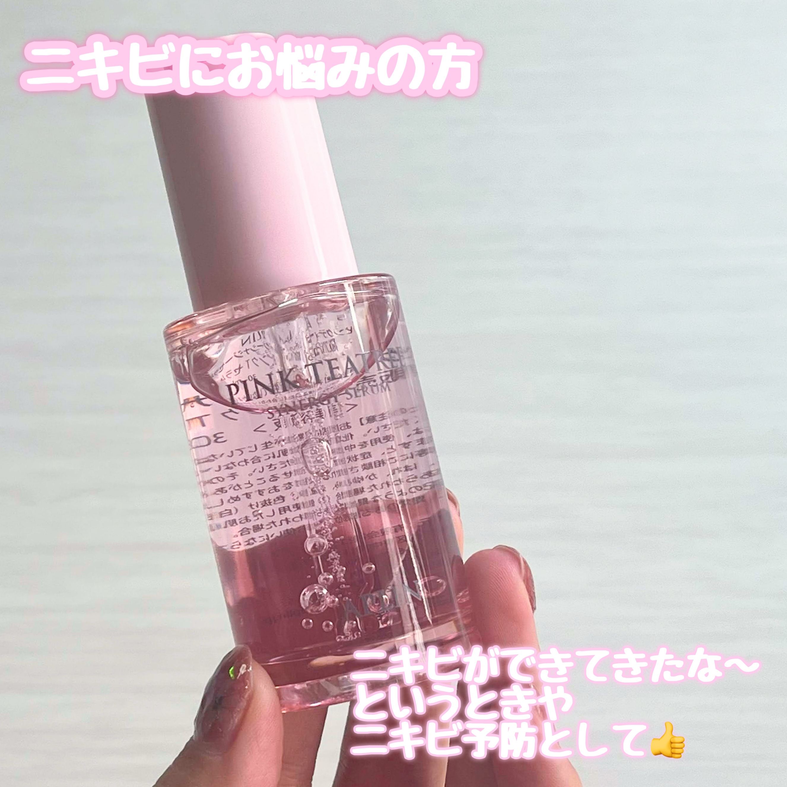 ピンクかわいいーーー! ってなるこのセラム🫶🏻 かわいいだけじゃ無いんです! 保湿成分のティーツリーやツボクサエキスなどのCICA成分や他にも優しいGREEN成分がたくさん! ほどよくとろみがあって、保湿感もあるんだけど重くない。