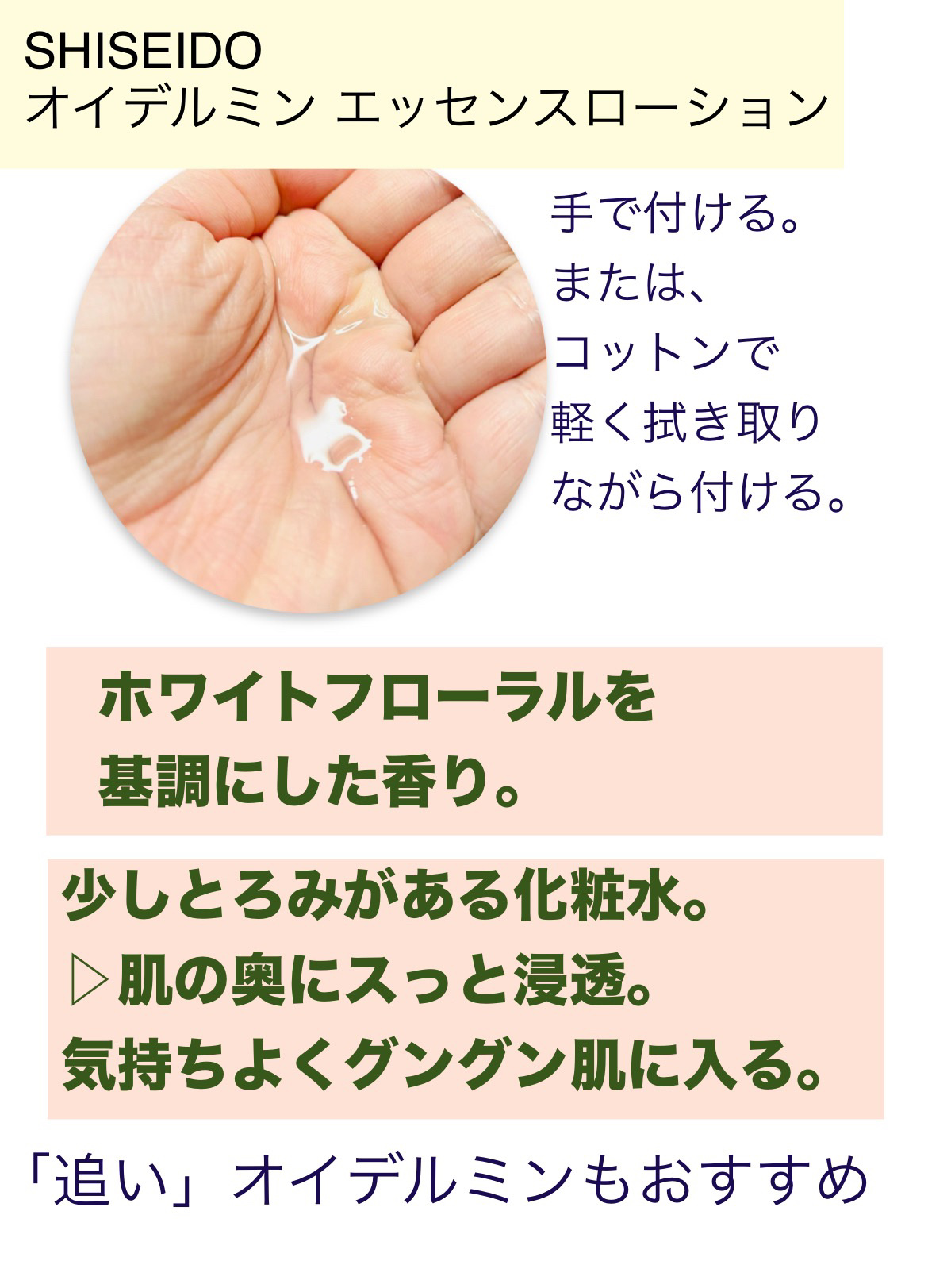 オイデルミンは資生堂が初めて発売した化粧品 130年前…1897年発売当時最先端であった西洋薬学技術を応用し処方されました 美肌の三大要素「透明感あふれる輝き」「ハリ・弾力」「なめらかさ」が整った状態に導きます 赤のパッケージ美しいです。香りは若干ローズっぽいけどローズすぎないフローラルな香りでした。
