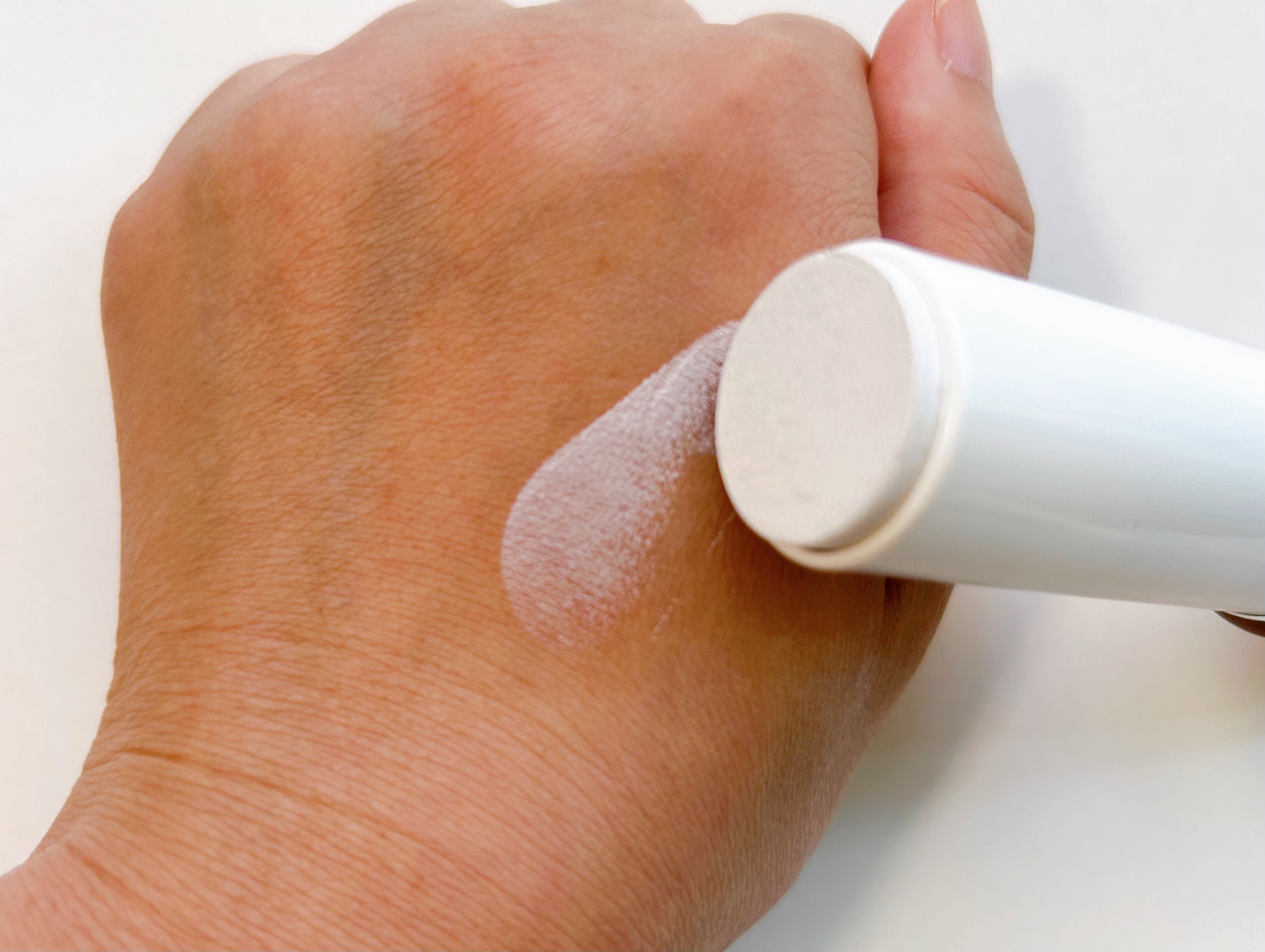 手の甲に乗せると、ほのかにキラキラと輝くラメが反射してとても綺麗です。 照明に当たると、キラキラがより反射して輝く印象を受けました。 擦っても落ちにくいスマッジタイプとのことで、汗が気になる春〜夏も安心と感じました。