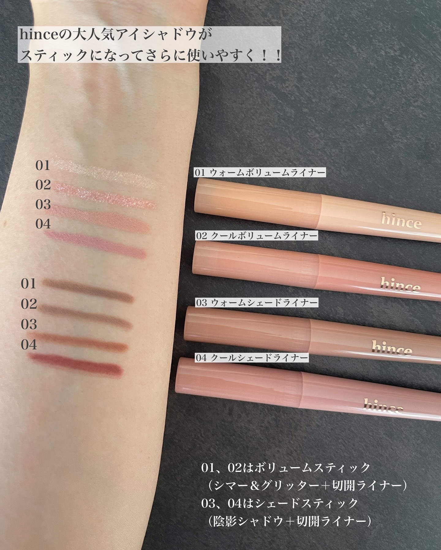 - 「ニューデップスアイシャドウ」の人気カラーをそのままスティックに適用し、涙袋はもちろん、チークやリップライナー、シェーディングとしてもマルチにご使用いただけます。 ✓ 用途別に最適化されたサイズでメイクアップの完成度を高める 左右が異なるサイズで構成されており、まぶたやチークなど広い部位はもちろん、目尻やリップライナーなどの細かい部位にも使用可能なマルチユースカラースティック ✓ ヒンスの人気シャドウがスティックに!粉飛びなく素早く簡単に感度の高いメイクを実現 ・「ニューデップスアイシャドウ」の人気カラーをスティックにして、いつでもどこでも素早く簡単に感度の高いメイクが可能 ・肌に浮き上がることなく自然に馴染む、多彩なパーソナルカラーを考慮して構成されたトーン別シェード ✓ なめらかなクリーミーで⻑時間密着するフィクシングフォーミュラ ・乾燥や角質で浮き上がったり、ヨレたりすることないクリーミーテクスチャー ・つっぱることなく、目元や口元にも使用できるスムーズなつけ心地 ・ブレンディングした後はしっかり密着し、⻑時間キープするフィクシングフォーミュラ 2024年10月14日(月)にQoo10、楽天のヒンス公式ショップにて先行発売。
