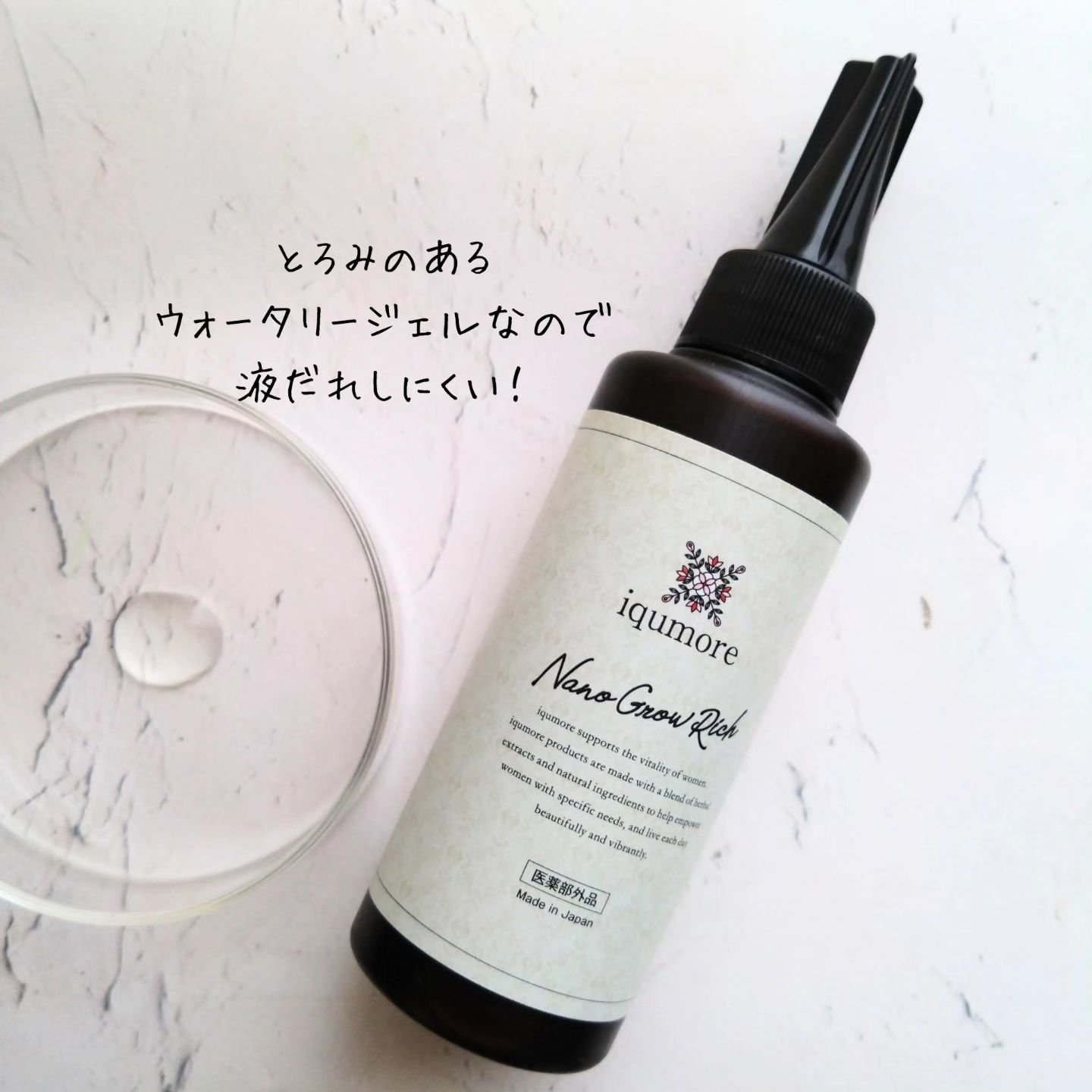 イクモアナノグロウリッチ 気になる薄毛や抜け毛のために有効成分3種類を配合し、健やかで力強い前向きな毛髪へ導く薬用育毛剤。 中身は透明のジェルタイプ。液だれや髪が濡れるのを防いでくれ、狙った部分に留まってくれるから使いやすいです。 薄毛や抜け毛に悩んでいる方に、使ってみていただきたい薬用育毛剤です!