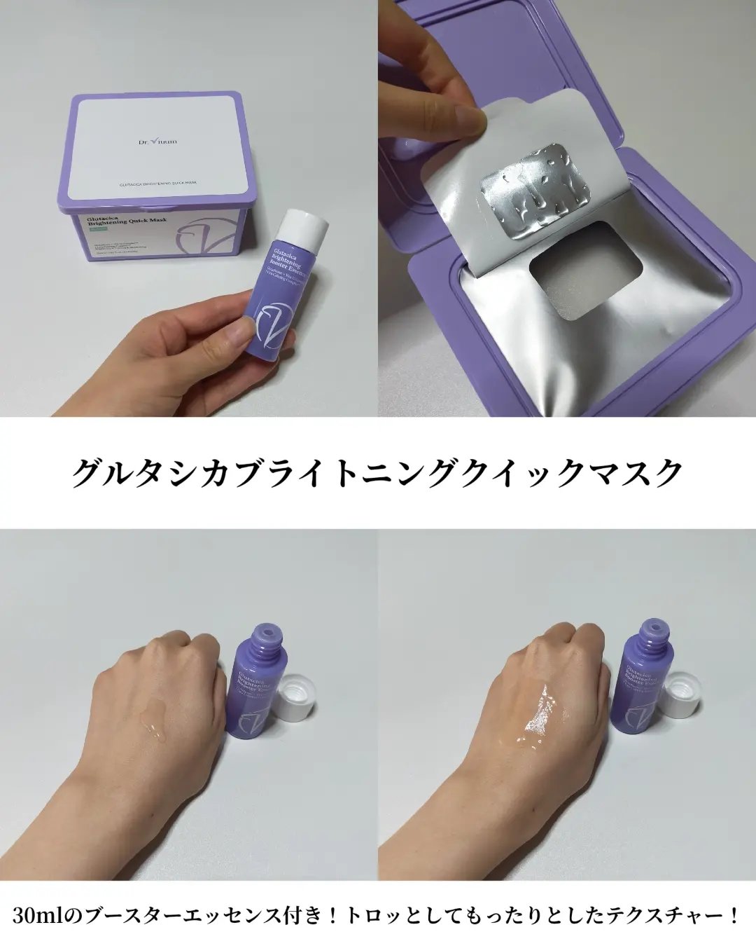 柔らかくて薄めのシートでサイズは小さすぎず大きすぎずちょうど良い。10分ぐらいでシートを取った後もまだエッセンスが残ってるから腕にもしっかり。 高濃度ビタミンCアンプルとはこれだ!って感じかな。香りもベタッとしたテクスチャーも塗った後のペタペタ感も。 みずみずしく伸びも良く腕にもスルスル塗りやすい。顔に塗ると少しピリピリするのと、日焼け止めっぽい香りが気になるから私はボディ用に使ってるかなー。
