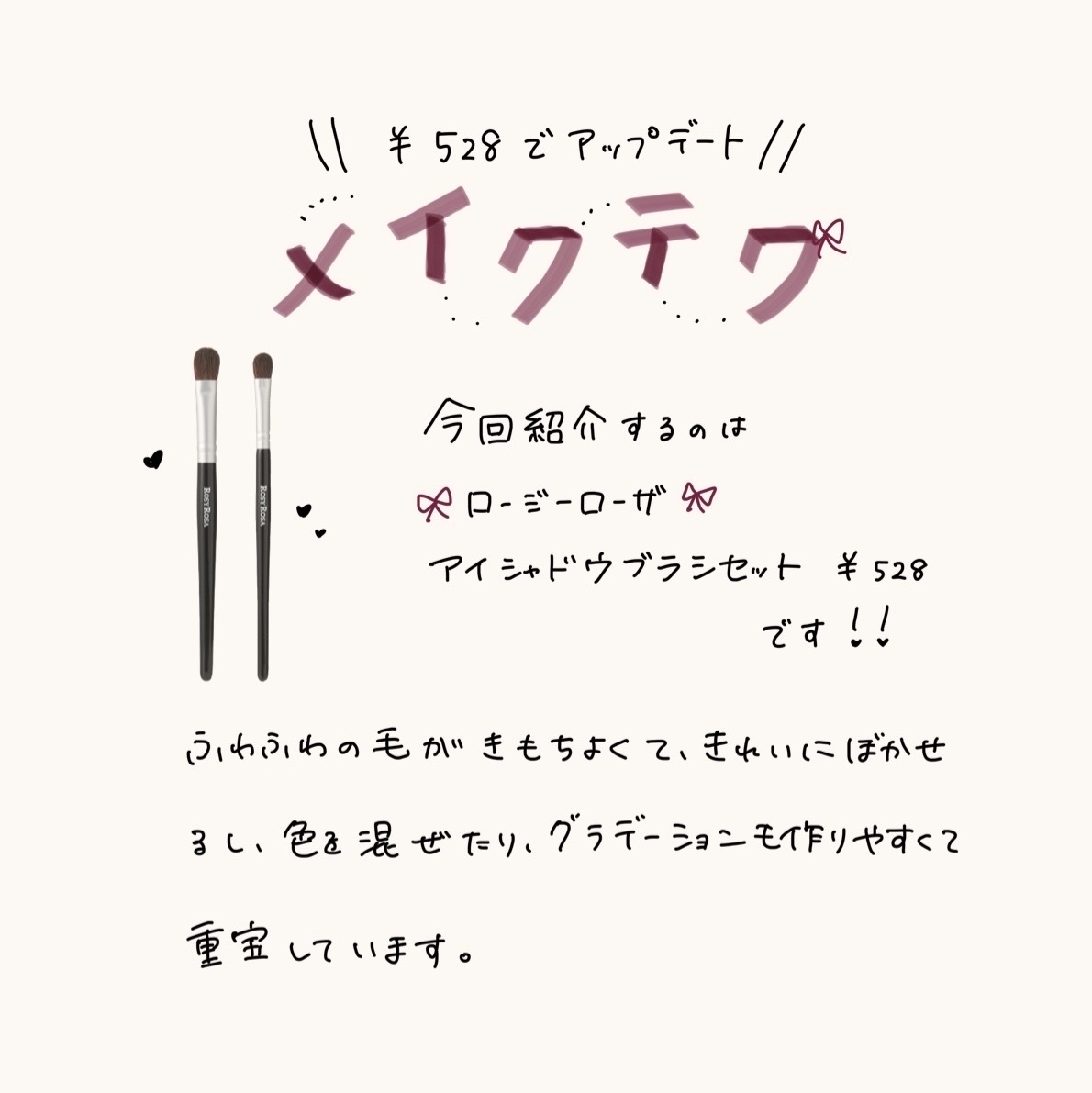 天然毛100%で約¥500って…しかも2本セットで🫶 粉含みも良くて、肌触りもフワッとしてて良い💓勿論グラデーションも作りやすい✨️ メイク初心者さんやアイメイクが苦手、グラデーションが上手く出来ないなどのお悩みがある方に是非1度使ってみてほしいブラシです🫶💕