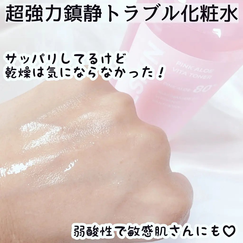 ピンクアロエビタトナーはトラブル肌のために作られたさっぱり系トラブル鎮静トナー。 鎮静効果がより高いピンクアロエが80%配合! 拭き取り化粧水としてもクールダウンパックとしても使えるから肌の水分補給をして急速に鎮静が期待できるよ! ほんのりピンクのトナーで、さらっとしたテクスチャー! 塗るとぐんぐん浸透して乾燥してつっぱったも吸いつくようなもっちり肌に✨