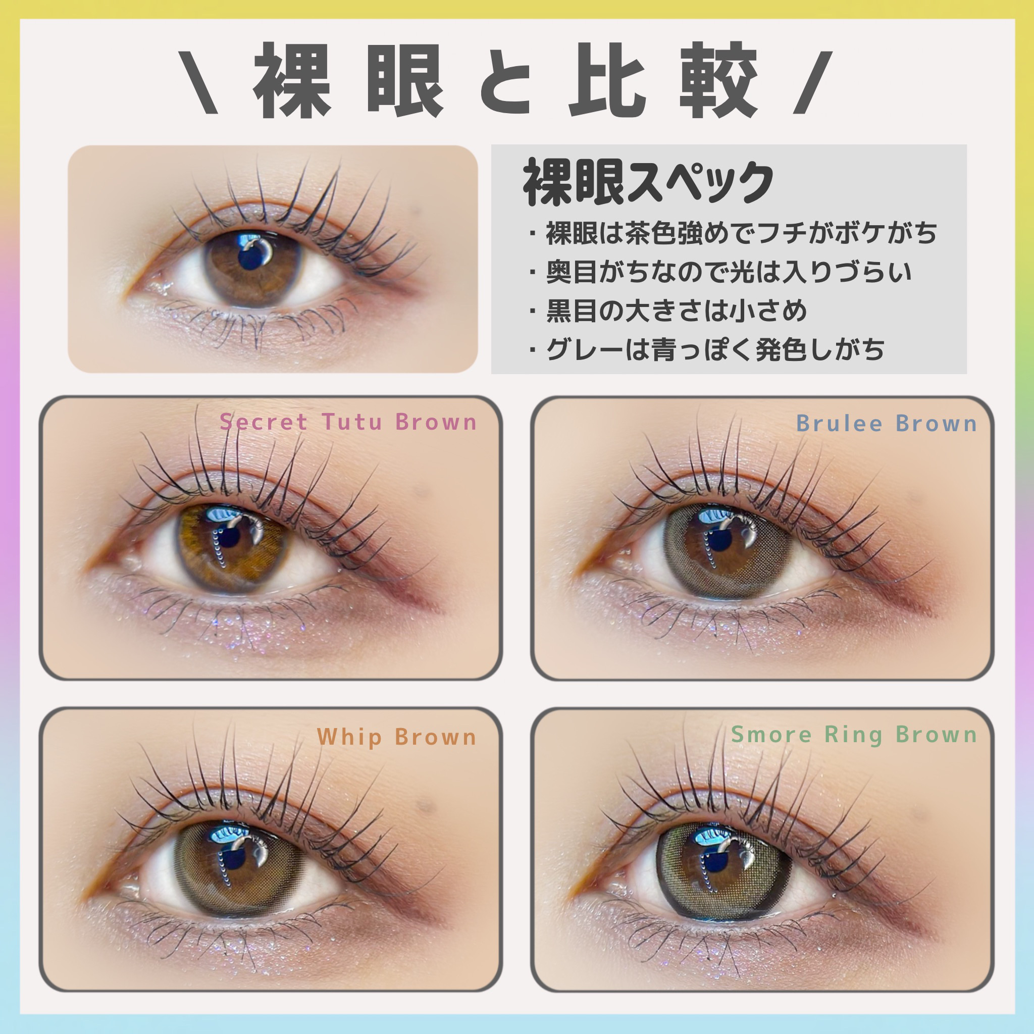 - ※2025年6月以降、商品パッケージ裏面・側面の一部表記を順次変更いたします。尚、これにかかる商品の交換・返品は承っておりません。 『わたしにハマる♡盛れ発色ブラウン』4色のカラーラインナップ ■ヒミツのちゅるんブラウン Secret Tutu Brown (シークレットチュチュブラウン) DIA:14.2mm 着色直径:11.2mm ニュアンスブラウンカラーが自然に瞳のトーンアップを演出してくれる裸眼風デート系レンズ。 ■はかなげ大人っぽブラウン Brulee Brown(ブリュレブラウン) DIA:14.5mm 着色直径:13.8mm トレンドの白っぽブラウン×ふわっとフチデザインで、大人っぽい瞳を演出。 ■甘っぽモテブラウン Whip Brown(ホイップブラウン) DIA:14.5mm 着色直径:13.8mm まろやかベージュブラウン×ぼかしフチデザインで、明るく優し気な瞳を演出。 ■あざとよくばりブラウン Smore Ring Brown(スモアリングブラウン) DIA:14.5mm 着色直径:13.8mm こなれアッシュブラウン×くっきり太フチデザインで、きゅるっと可愛らしい瞳を演出。 カラーコンタクトレンズの不適正使用による眼障害の危険性等などがあります。 ●コンタクトレンズは高度管理医療機器です。不十分な洗浄・消毒など不適切なケアや、長時間・交換期間を超えた装用により、アレルギー性結膜炎、角膜感染症、角膜潰瘍等の重篤な眼障害が発生する危険性があります ●ご使用前に取扱説明書を確認してください 使用上の留意事項 ●眼科医院等を受診してからお求めください ●眼に異常を感じたら直ちにレンズ使用を中止し、お近くの眼科等で診察を受けてください ●医師の指示にしたがってご使用ください ●コンタクトレンズを装用する場合、自覚症状がなくても、眼科医院等での定期検査を受けてください ●レンズに不具合がある場合は使用しないでください