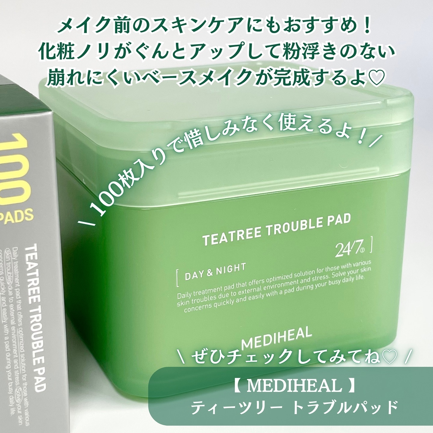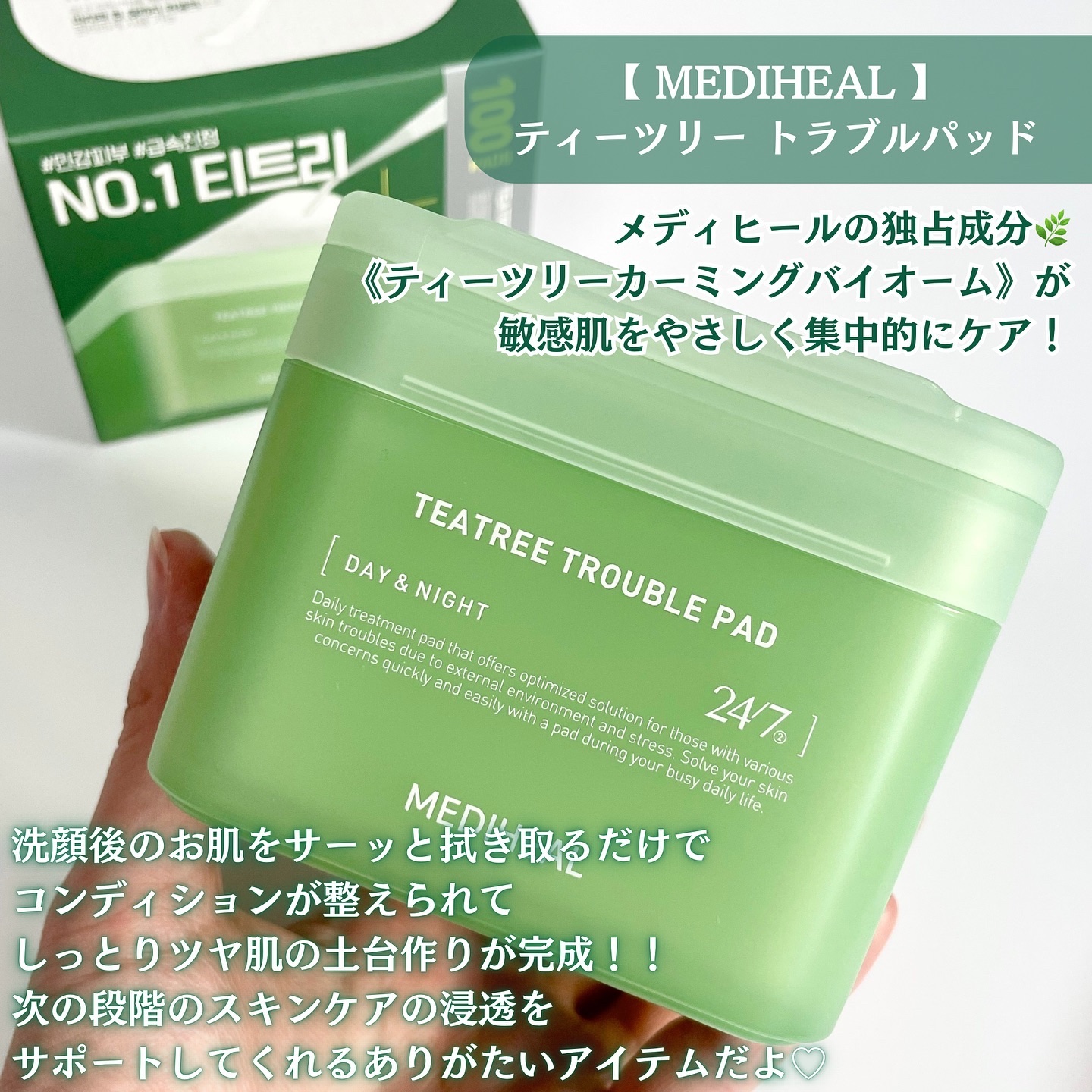 マルチに使える💖 メディヒールの独占成分✨ ティーツリーカーミングバイオーム‼️ 優しい使い心地で使いやすすぎる💟 拭き取りケアは2枚重ねて使用するのもおすすめ💕 毎日使えるトナパがあるのはとってもありがたいです🌟 このパッドは旦那も気に入っていて、ベタベタしないし、サッパリだから男の人でも使いやすいと思います🧡